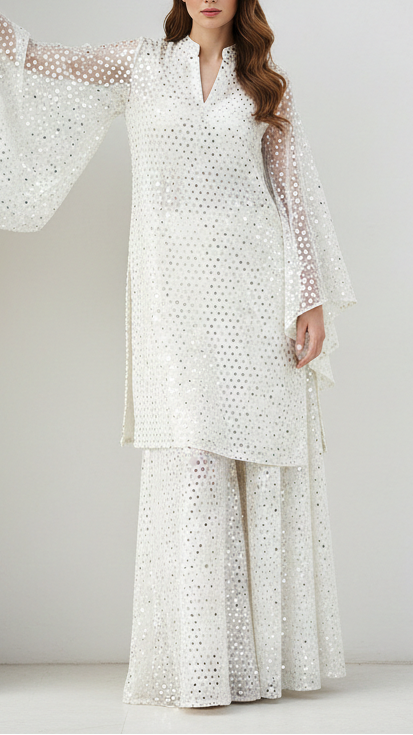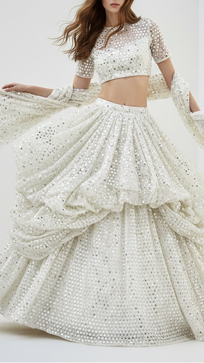 | Fabric Name | White Dyeable Georgette Fabric With All Over Faux Mirror, Thread Work |