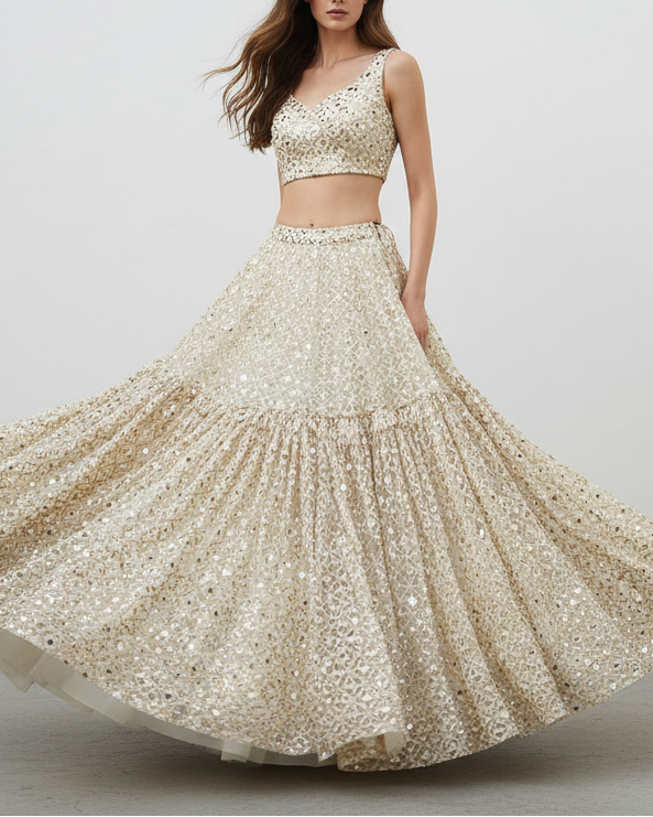 | Fabric Name | White Dyeable Georgette Fabric With All Over Sequins, Faux Mirror And Zari Work |