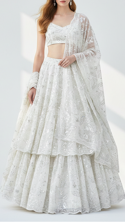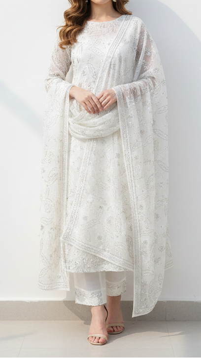| Fabric Name | White Dyeable Georgette Fabric With All Over Thread, Katdana And Sequins Work |