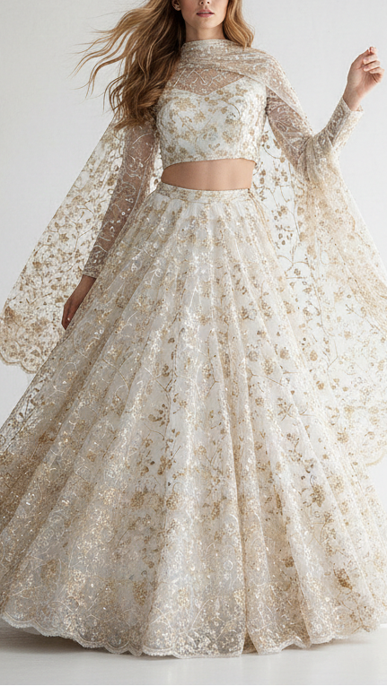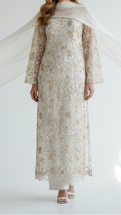 | Fabric Name | White Dyeable Net Fabric With All Over Thread, Sequins And Katdana Work |