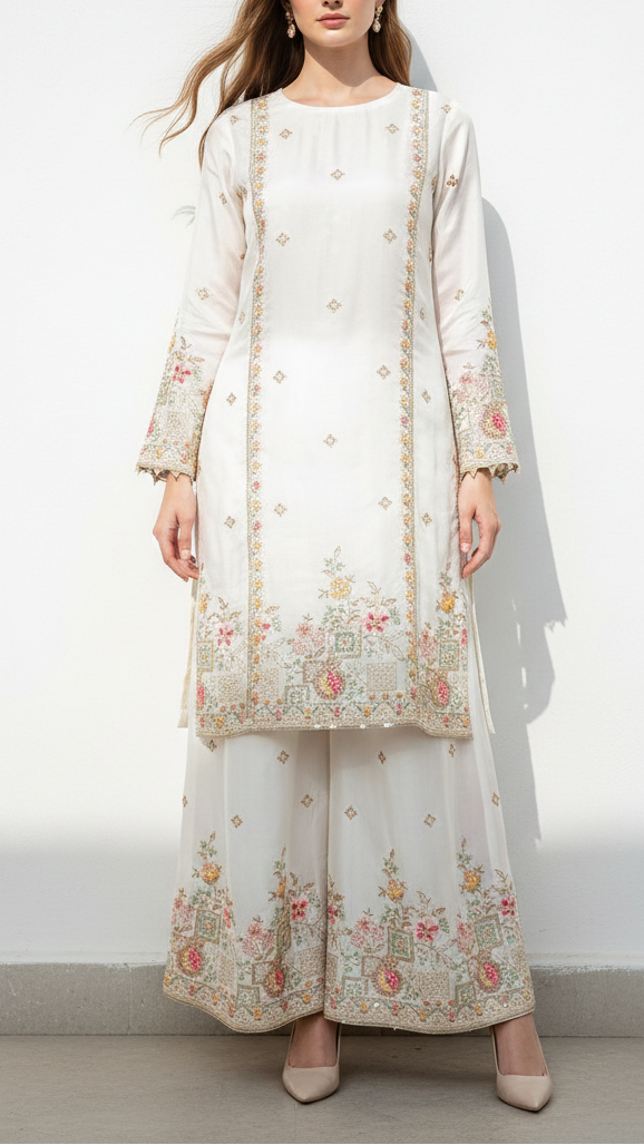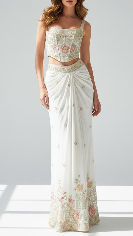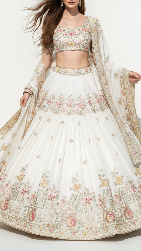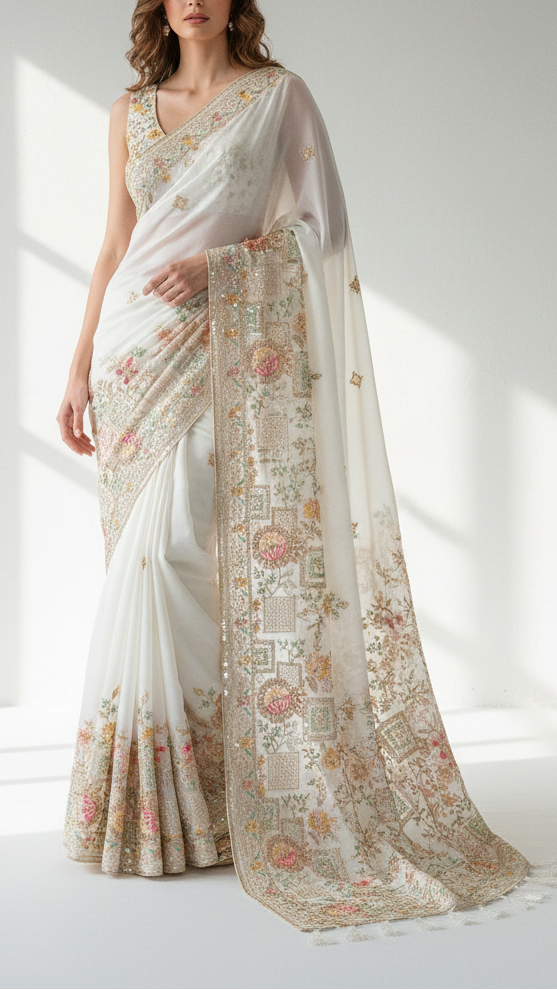 | Fabric Name | White Dyeable Organza Fabric With All Over Sequins, Bead, Katdana And Multi Color Thread Work With One Side Border |