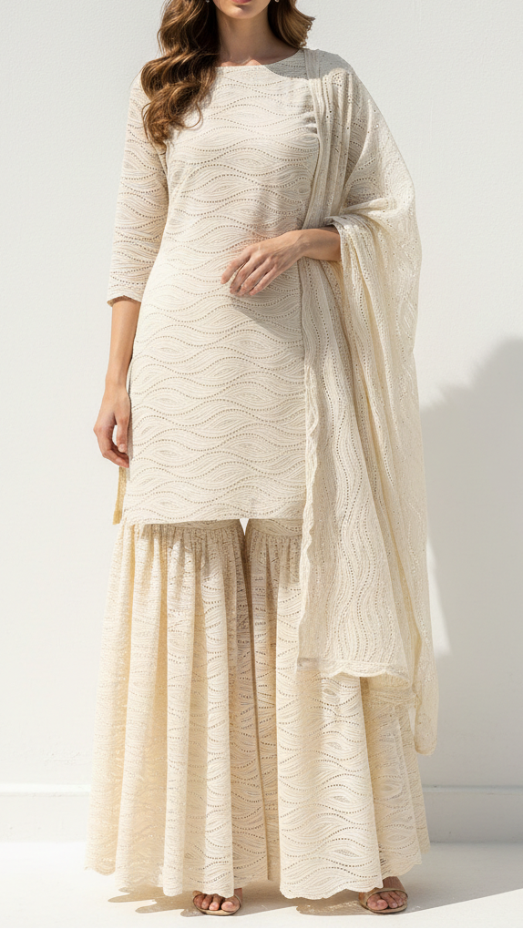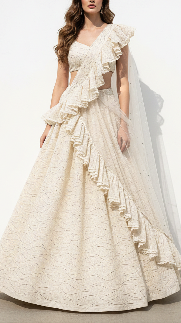 | Fabric Name | White Dyeable Silk Fabric With All Over Thread And Faux Mirror Work |