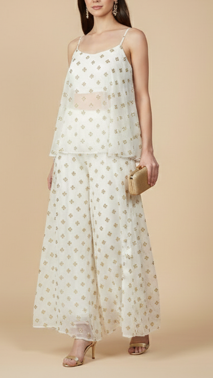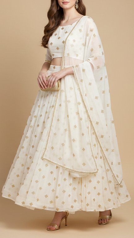 | Fabric Name | White Dyeable Georgette Fabric With All Over Buti Of Katdana And Bead |
