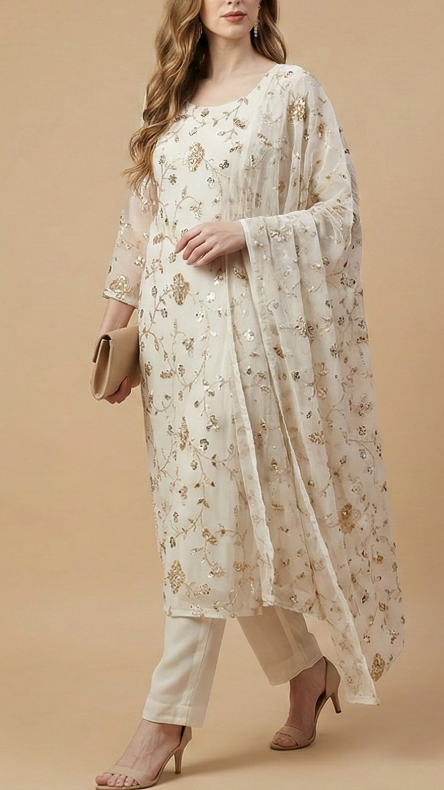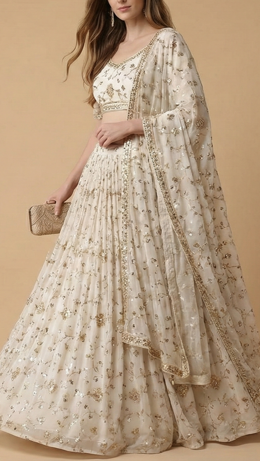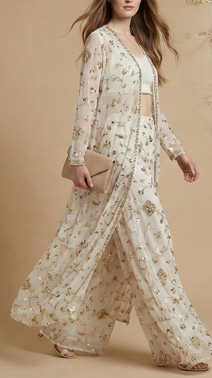 | Fabric Name | White Dyeable Georgette Fabric With All Over Buti Of Sequins, Katdana And Bead |
