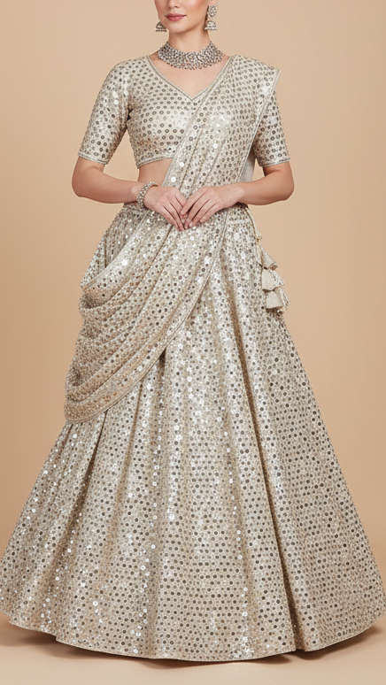 | Fabric Name | White Georgette Fabric With All Over Faux Mirror And Zari Work |