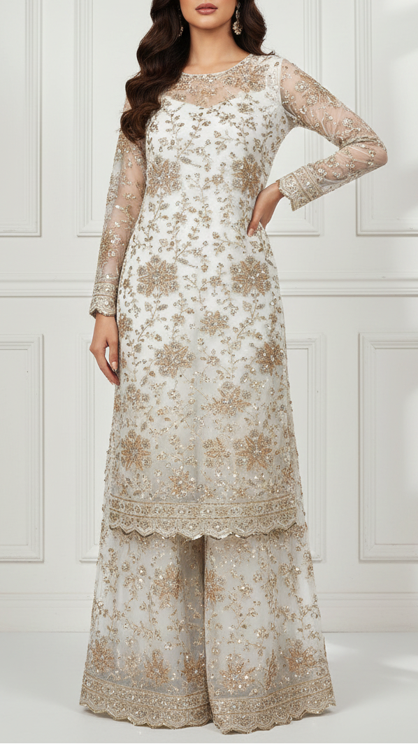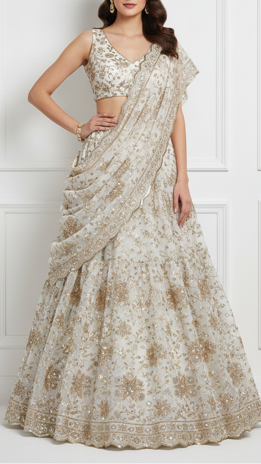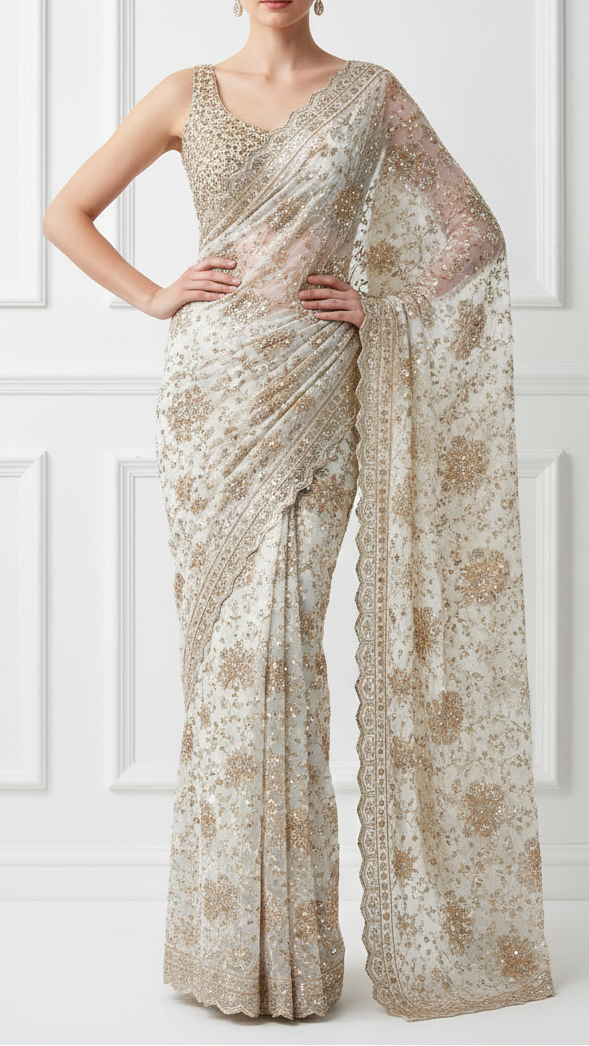 | Fabric Name | White Georgette Fabric With All Over Jaal Pattern Of Katdana, Zari, Sequins And Bead Work With One Side Border |