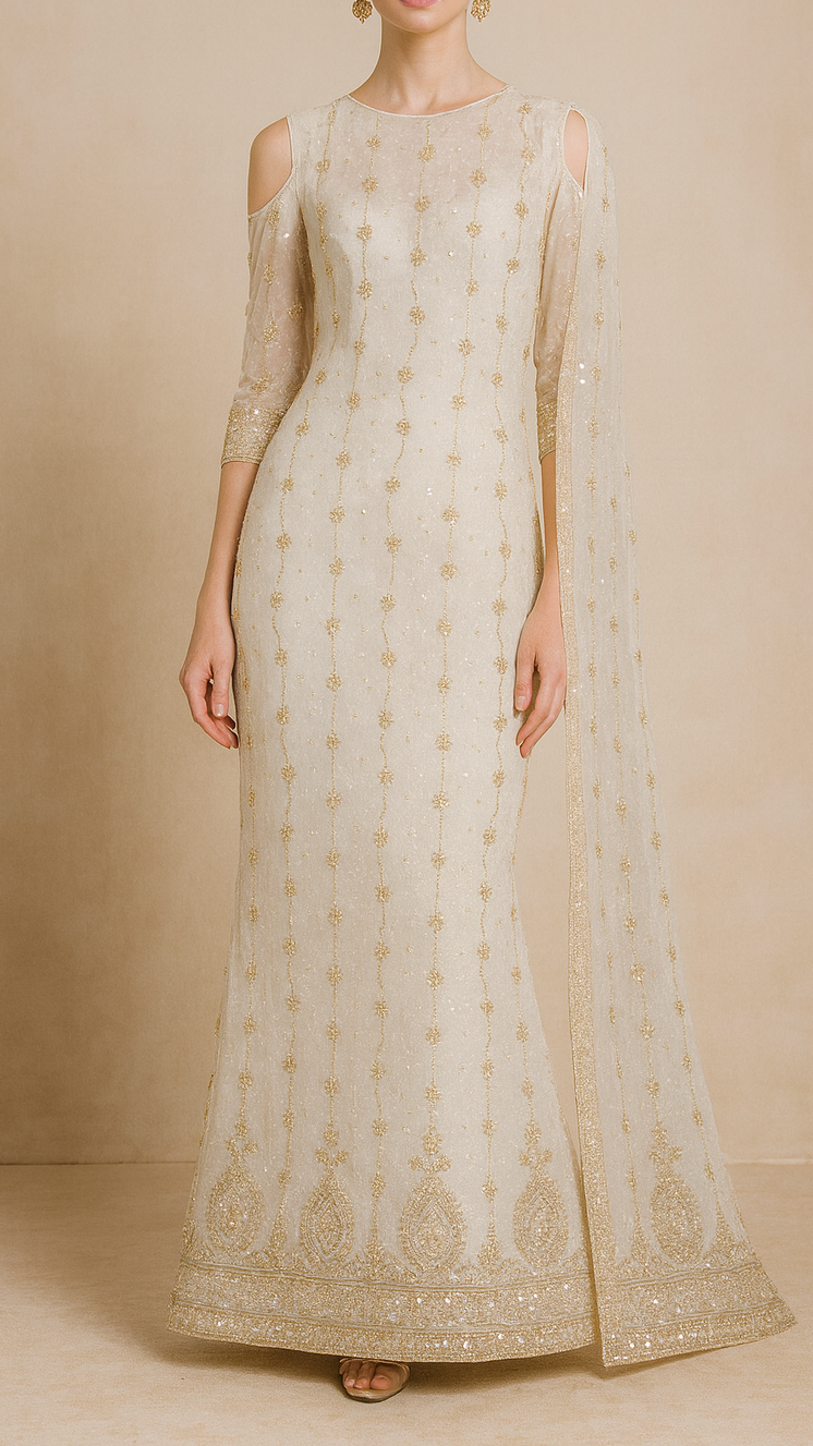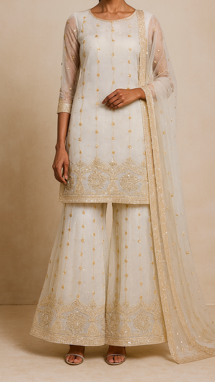 | Fabric Name | White Georgette Fabric With All Over Katdana, Bead, Zari And Sequins Work With One Side Border |