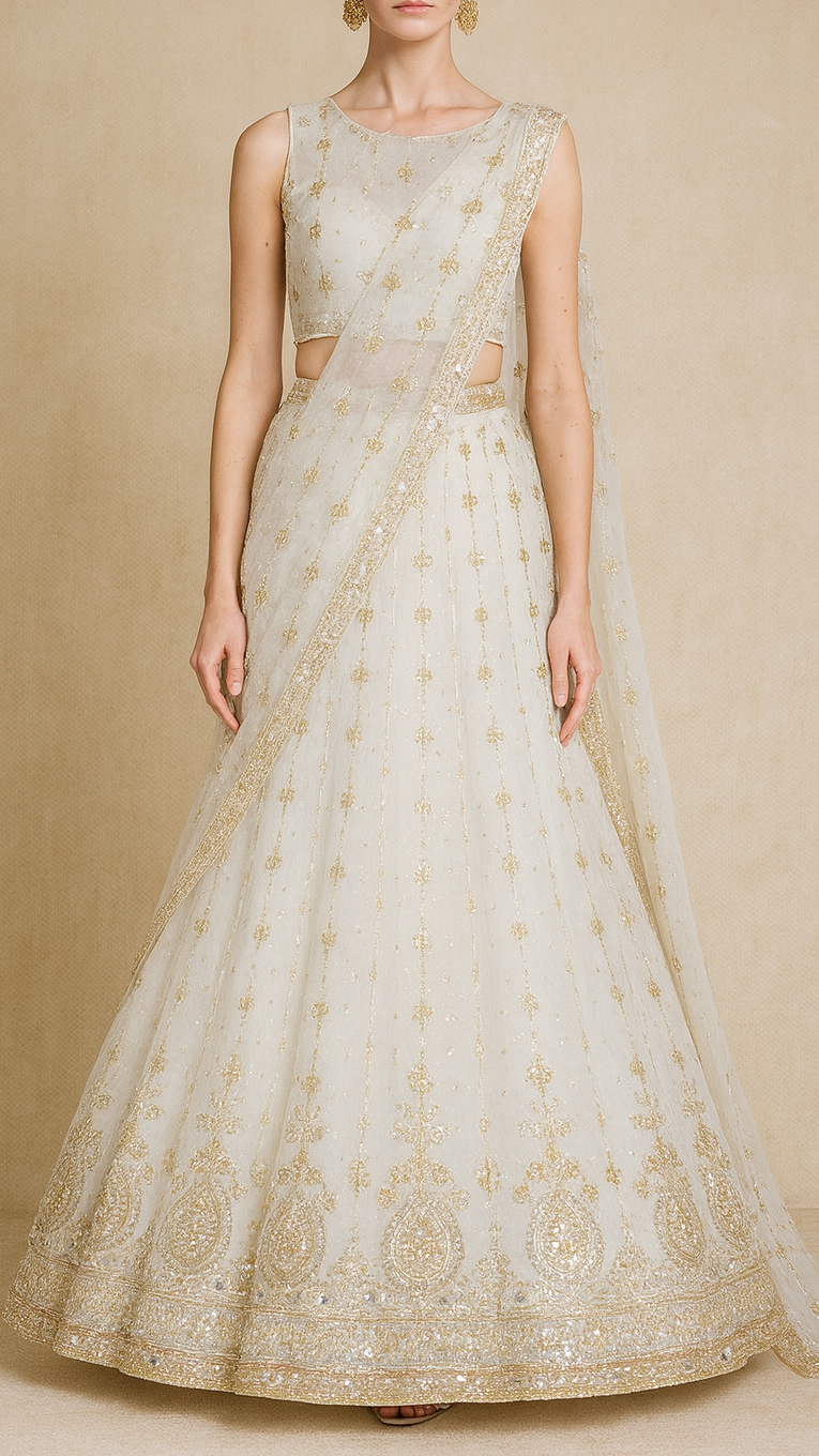 Ideal for sarees, lehengas, gowns, and dupattas, this fabric beautifully blends traditional craftsmanship with modern luxury. The intricate embellishments and bordered detailing make it a perfect choice for weddings, receptions, and festive occasions.