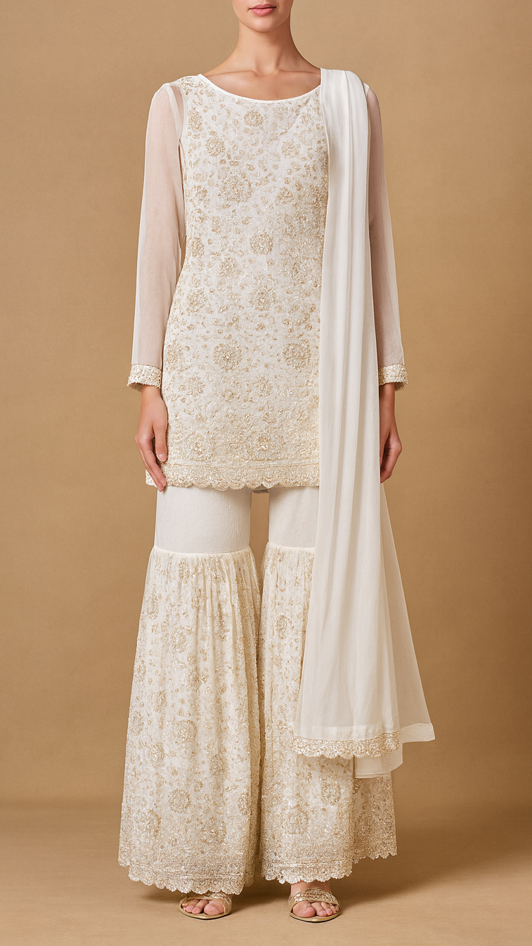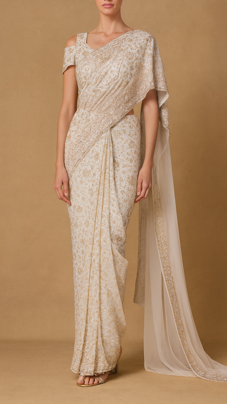 | Fabric Name | White Georgette Fabric With All Over Katdana, Sequins, Bead And Zari Work With One Side Border |