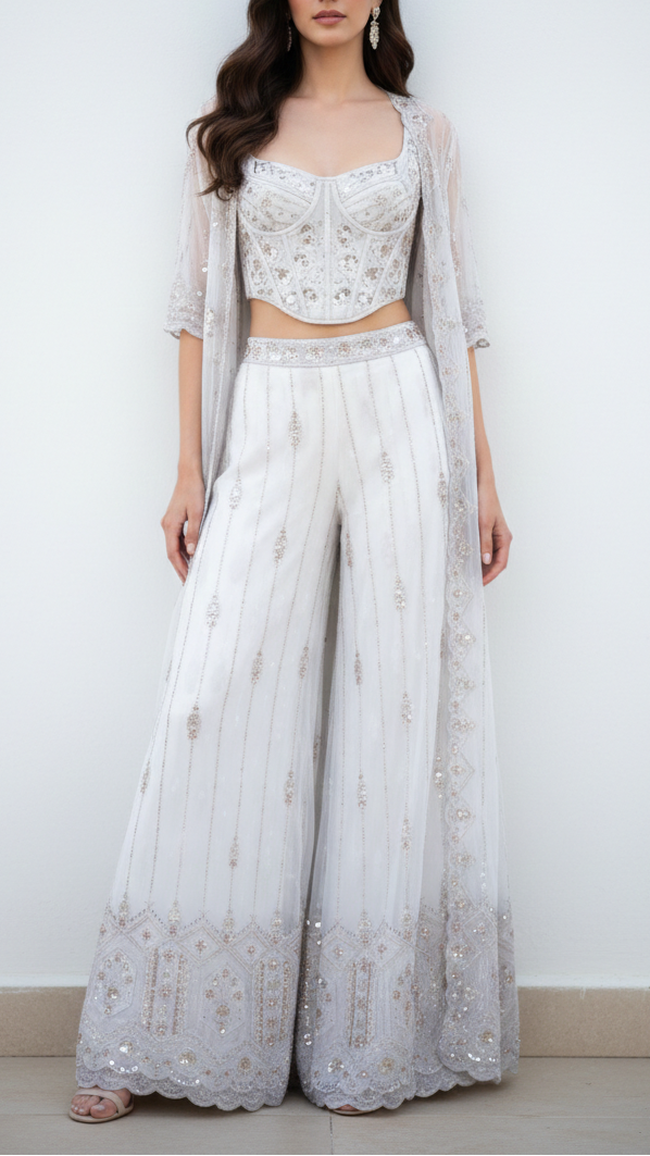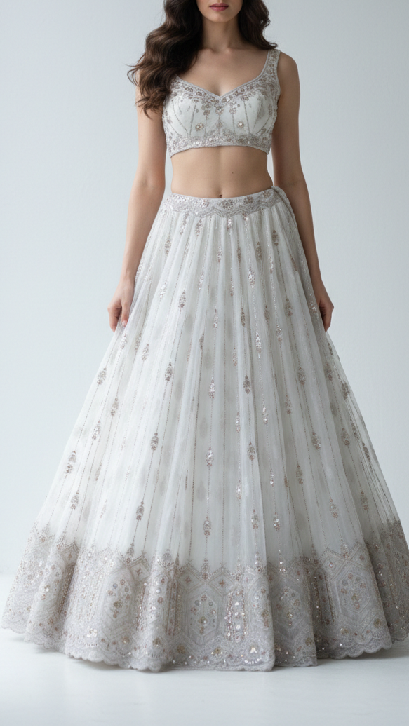 Ideal for sarees, lehengas, gowns, and dupattas, this fabric enhances both modern and traditional outfits. The ornate embellishments with the cutwork border make it a standout choice for weddings, receptions, and celebratory occasions, ensuring regal and statement-making drapes.