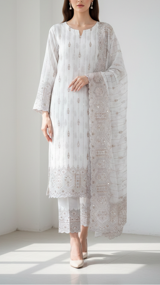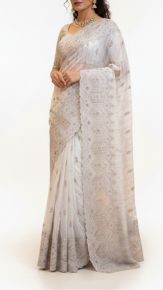 | Fabric Name | White Dyeable Georgette Fabric With All Over Katdana, Sequins, Zari And One Side Net Cutwork Border |