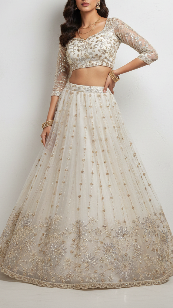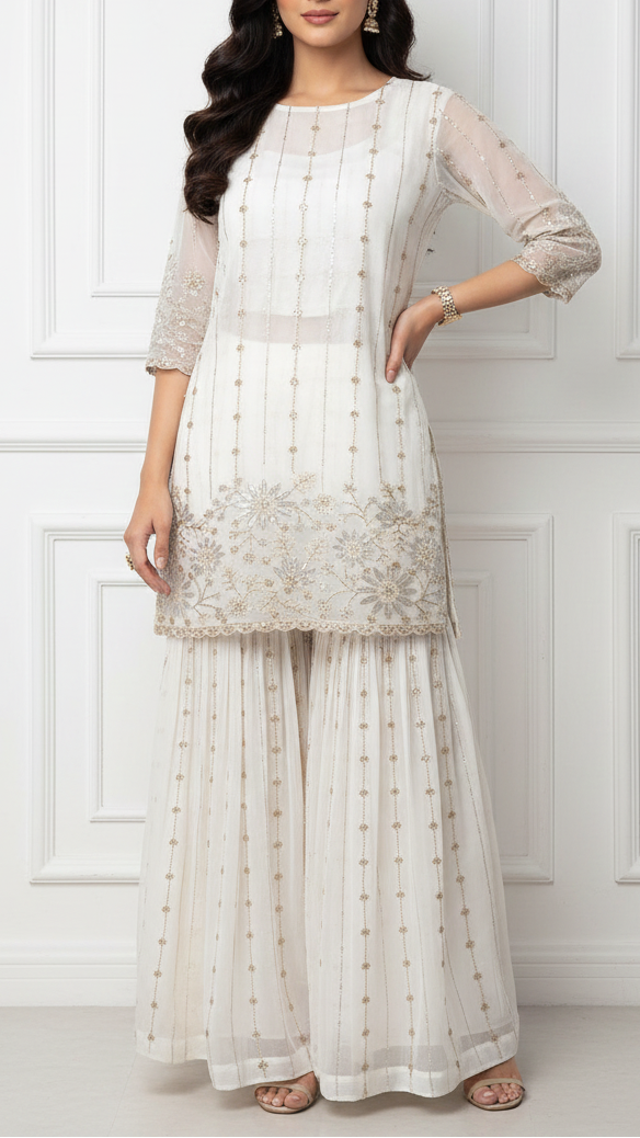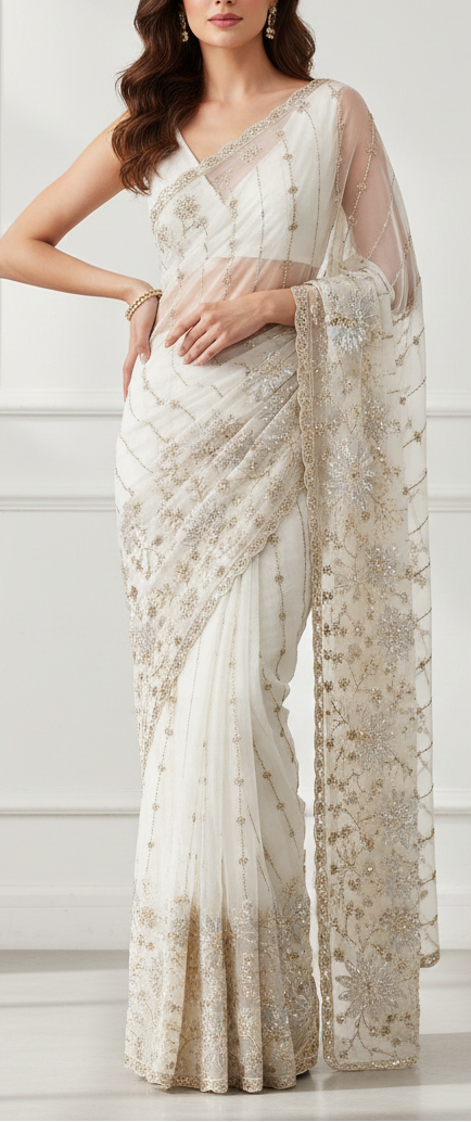 | Fabric Name | White Georgette Fabric With All Over Katdana, Zari, Bead And Sequins Work With One Side Border |
