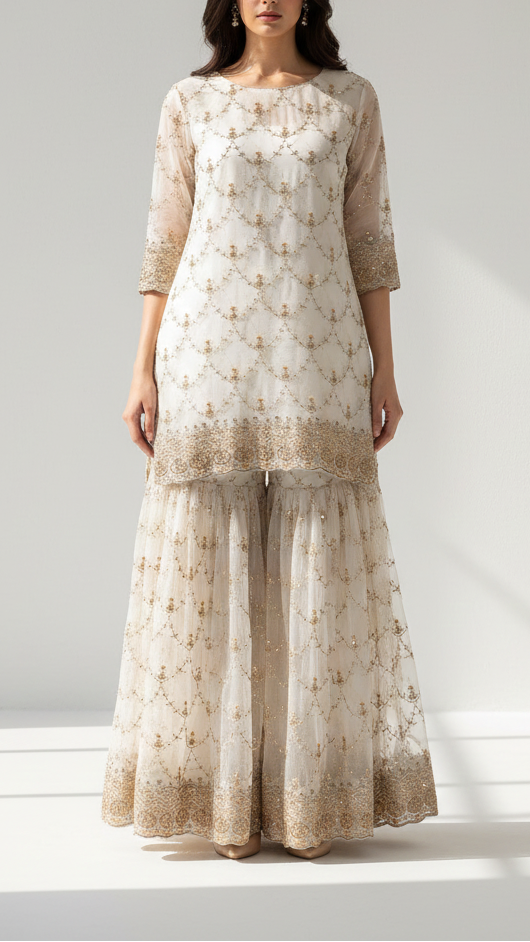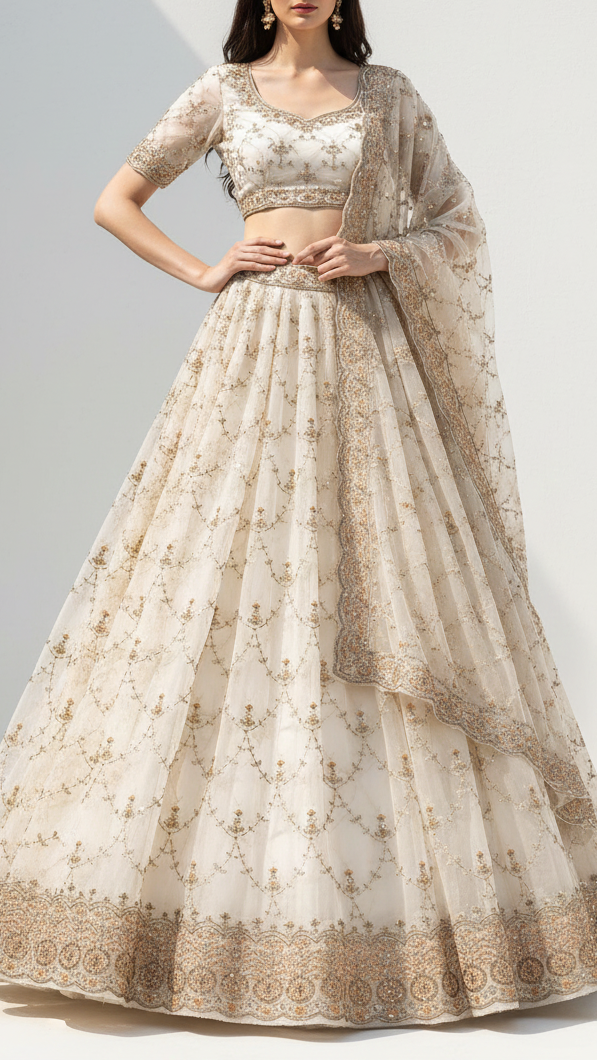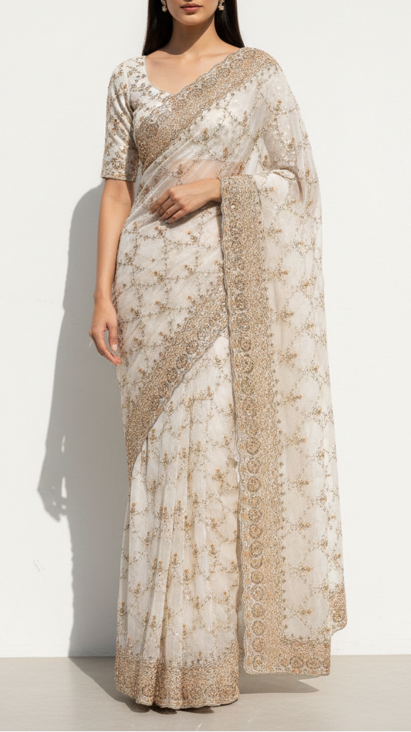 | Fabric Name | White Dyeable Georgette Fabric With All Over Katdana, Zari, Bead And Sequins Work With One Side Border |