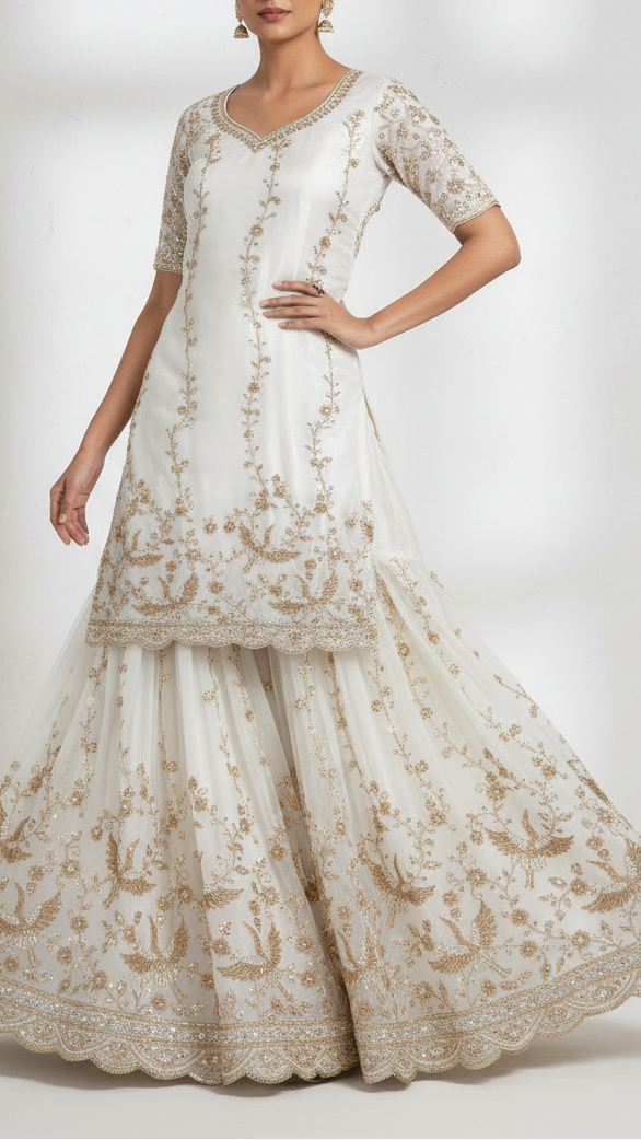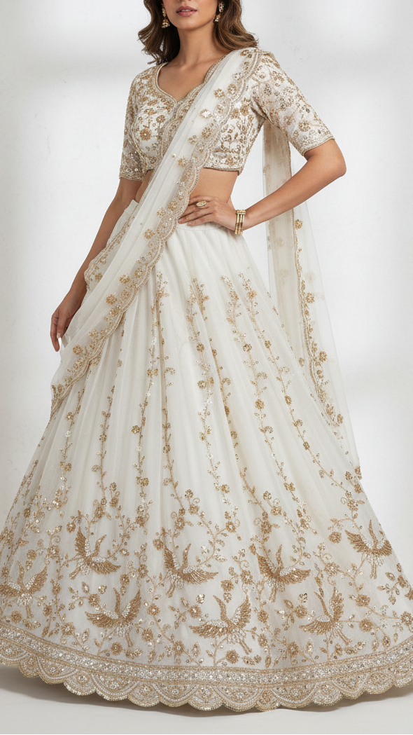 | Fabric Name | White Georgette Fabric With All Over Katdana, Zari, Sequins And Bead Work With One Side Border |
