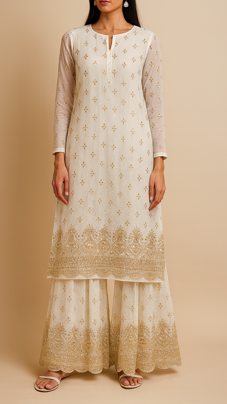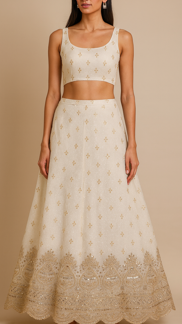 | Fabric Name | White Georgette Fabric With All Over Sequins And Zari Work With One Side Border |