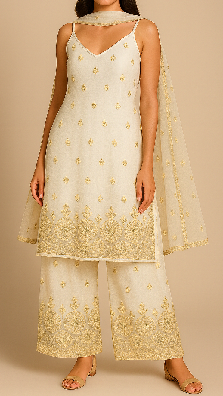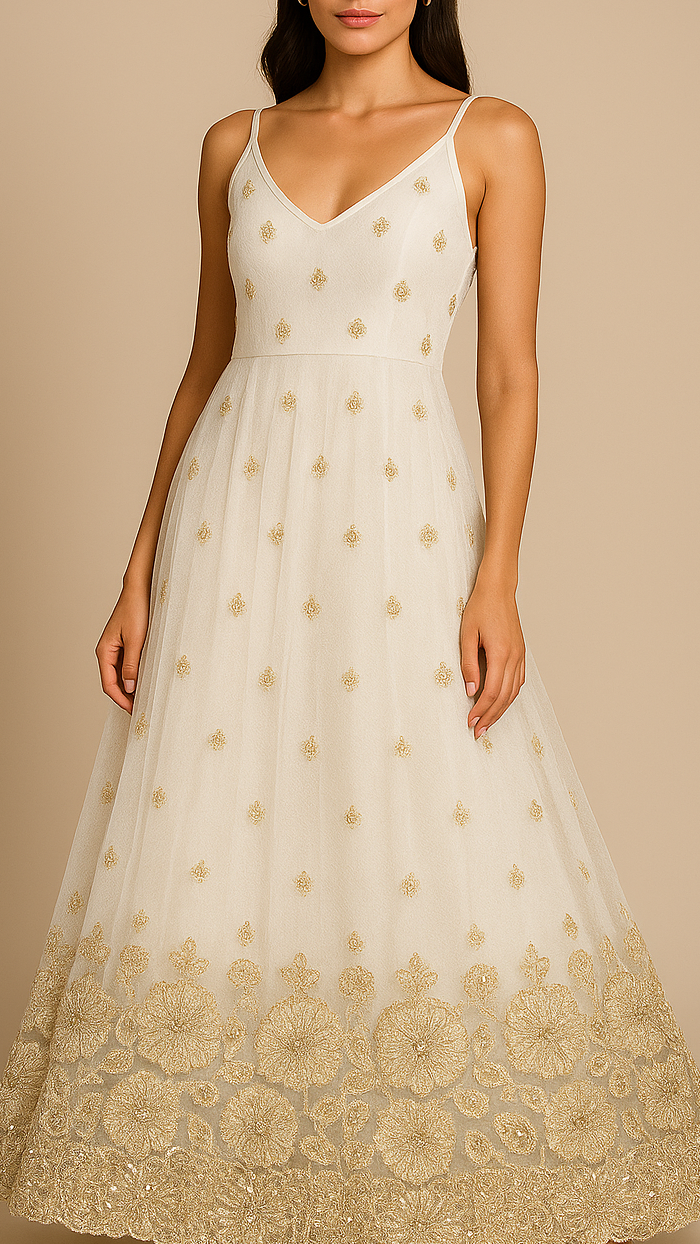 | Fabric Name | White Georgette Fabric With All Over Zari, Sequins And Bead Work With One Side Cutwork Border |