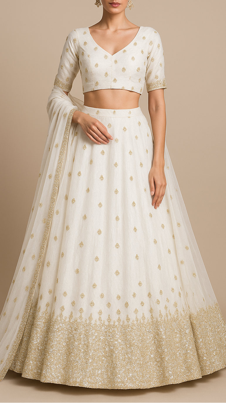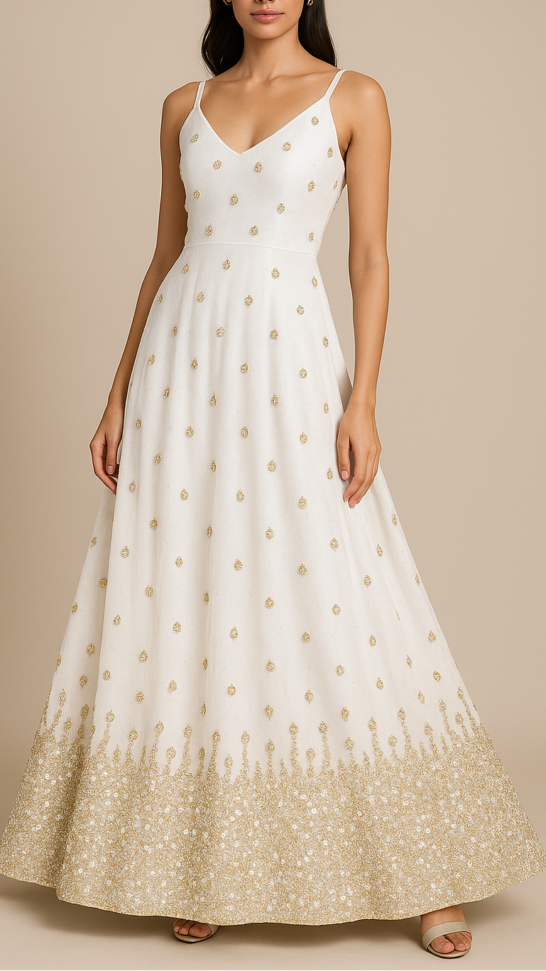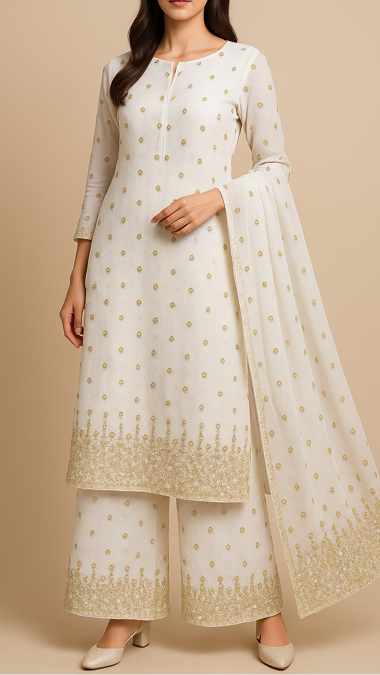 | Fabric Name | White Georgette Fabric With All Over Zari, Sequins And Bead Work With One Side Heavy Border |