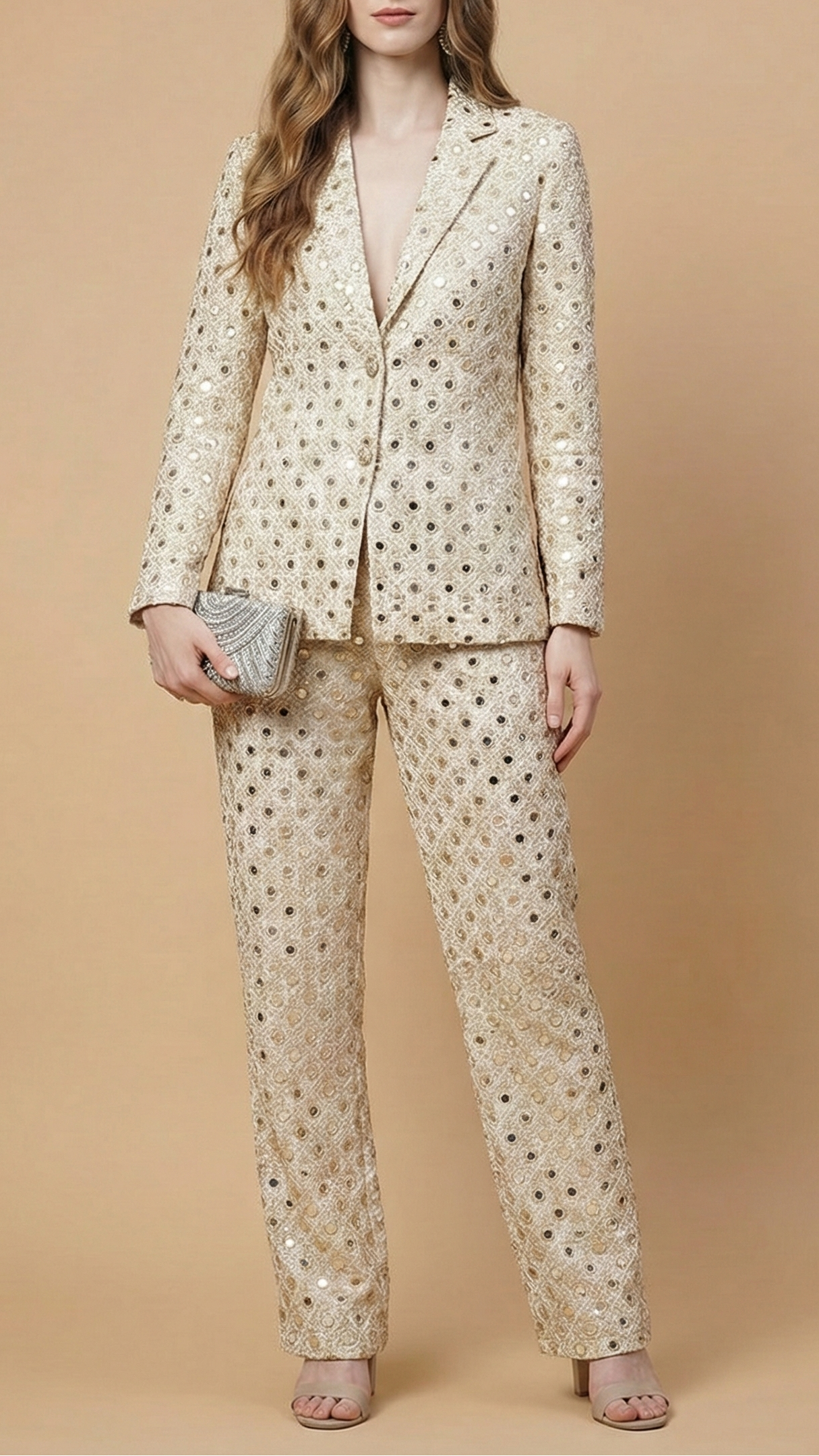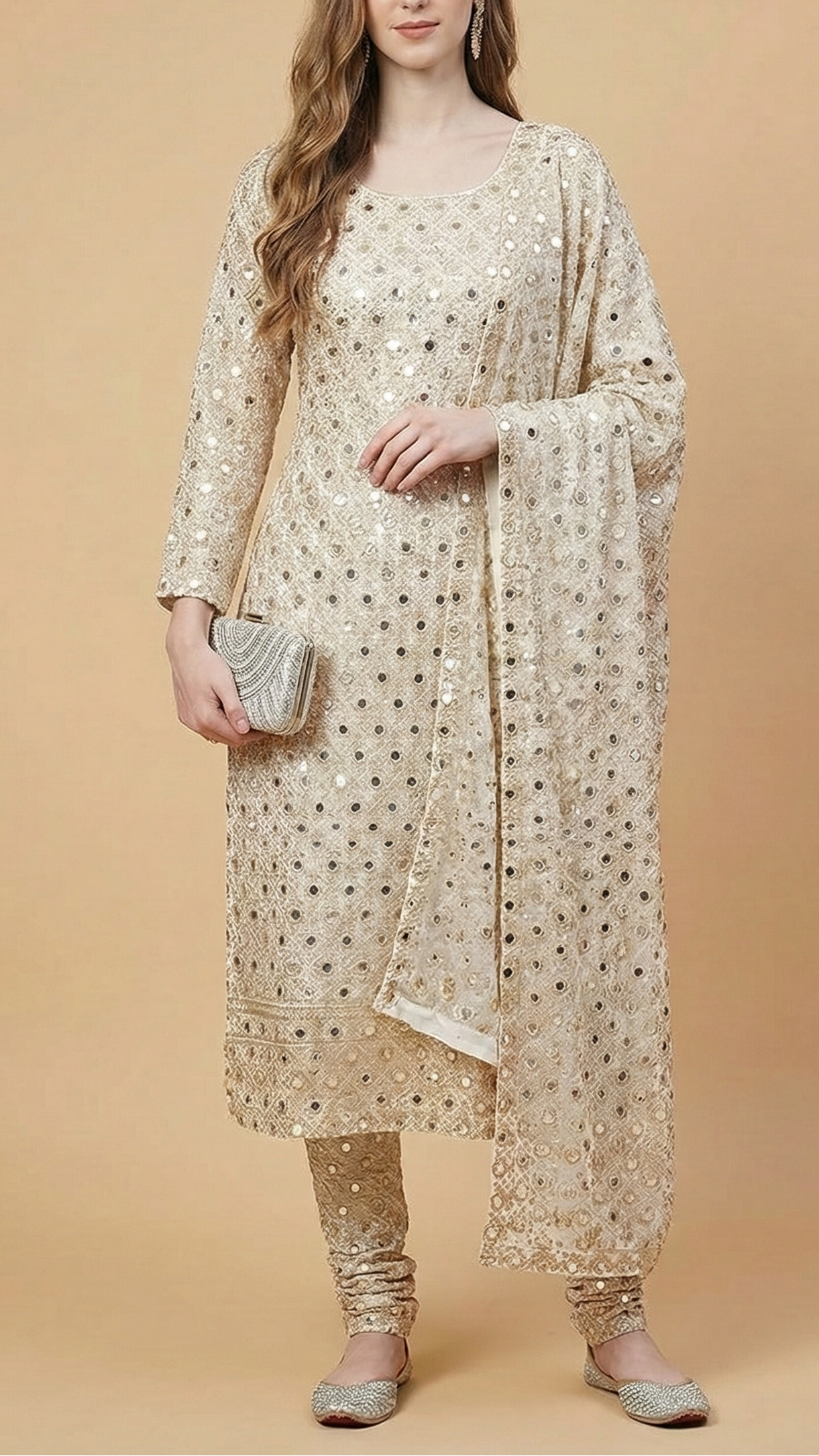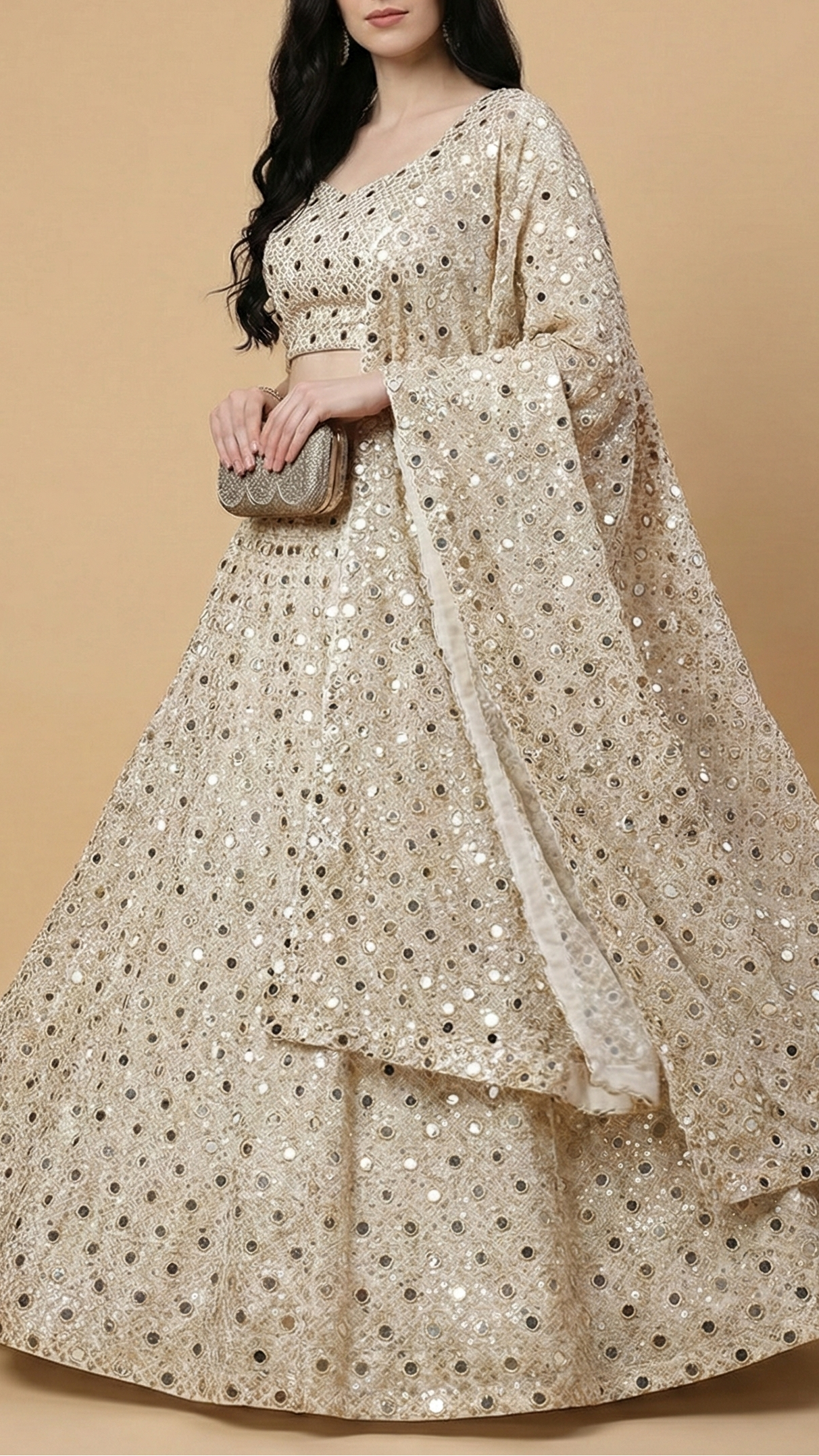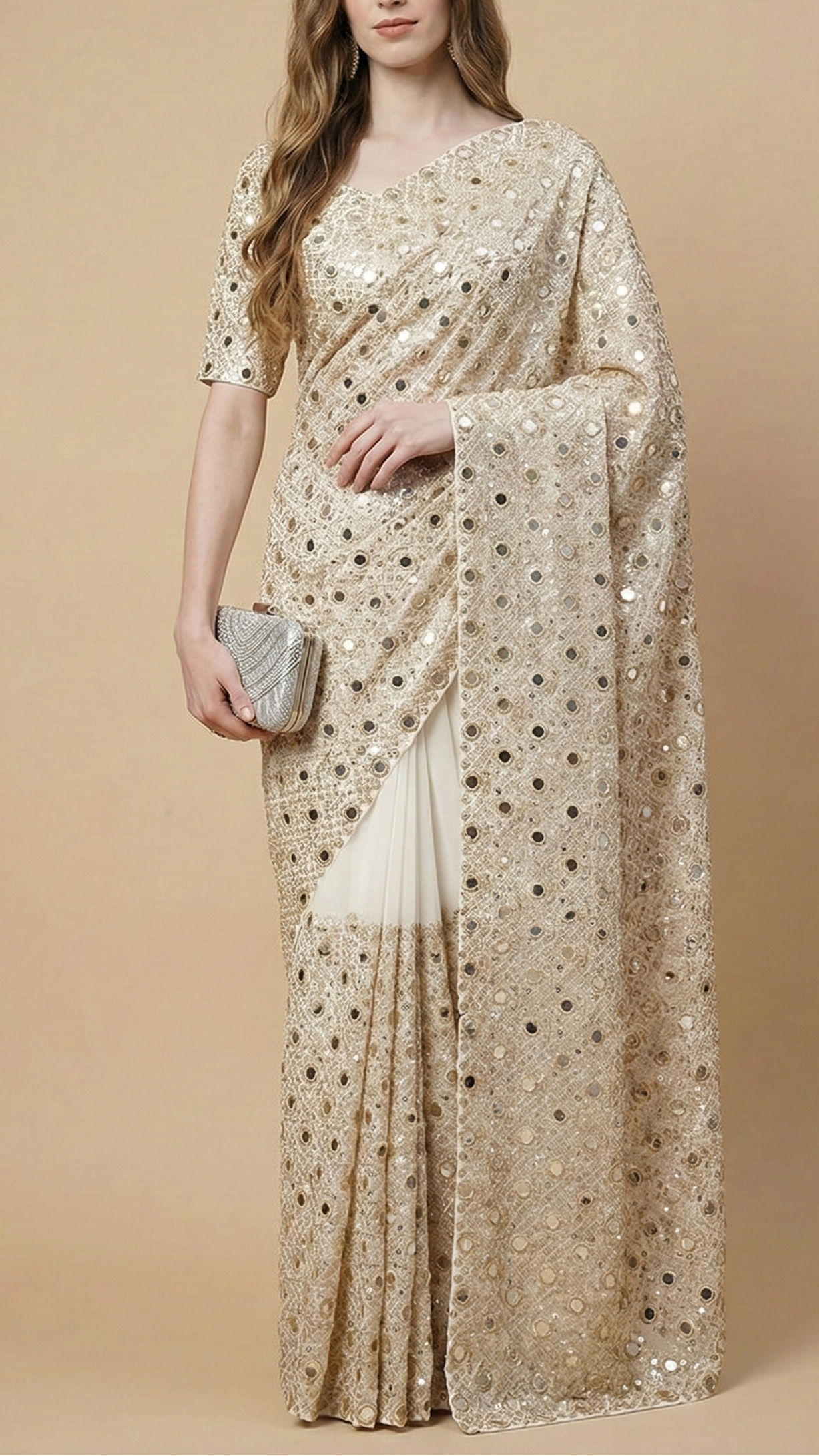 | Fabric Name | White Georgette Fabric With All Over Zari Sequins And Faux Mirror Work |