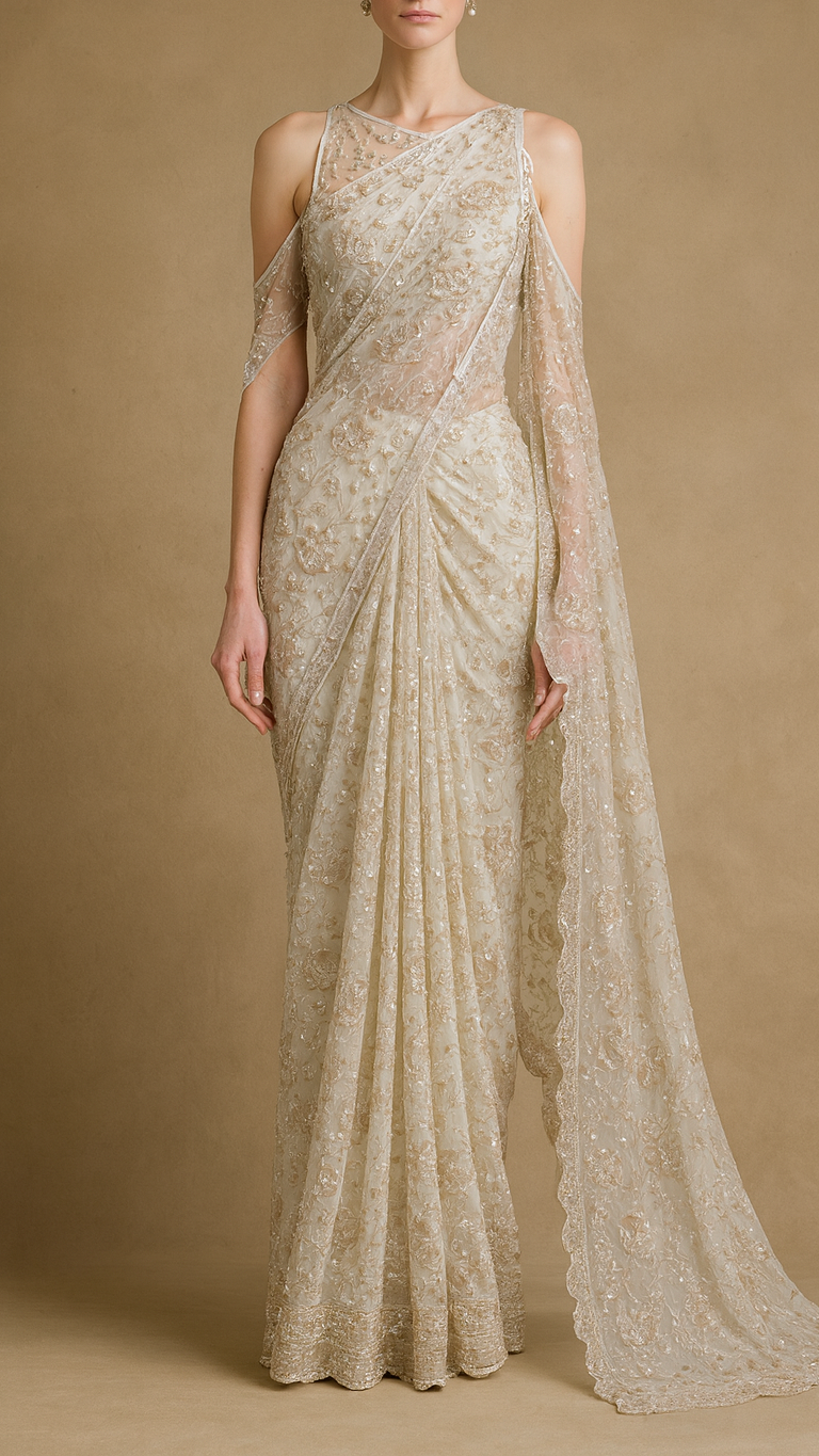 | Fabric Name | White Georgette Fabric with Allover Golden Zari, Sequins, Katdana and Pearl Work with One-Side Border |