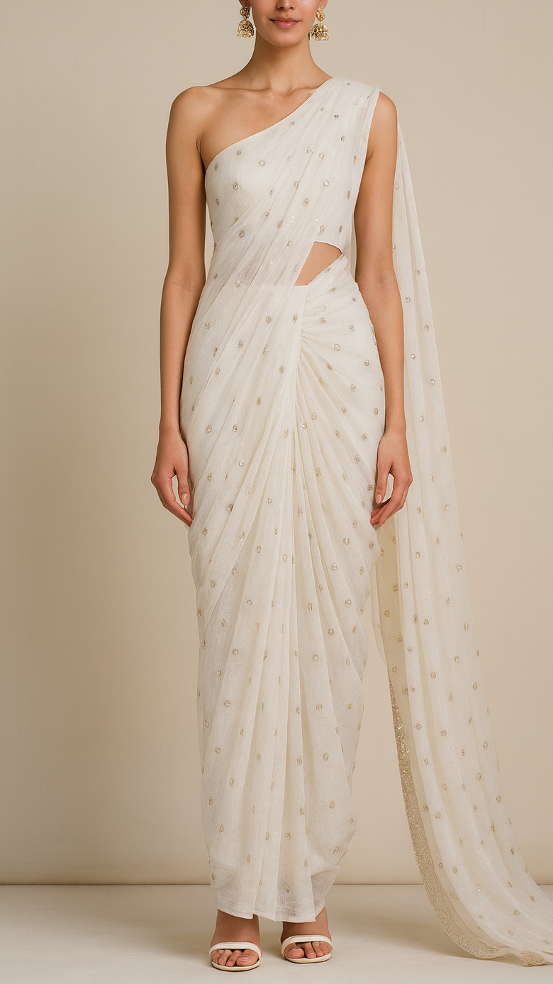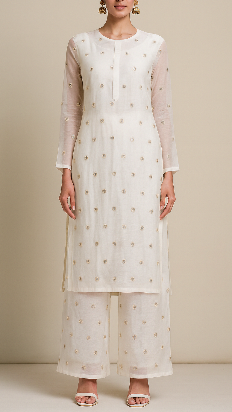 | Fabric Name | White Georgette Fabric with Allover Golden Zari and Faux Mirror Work |