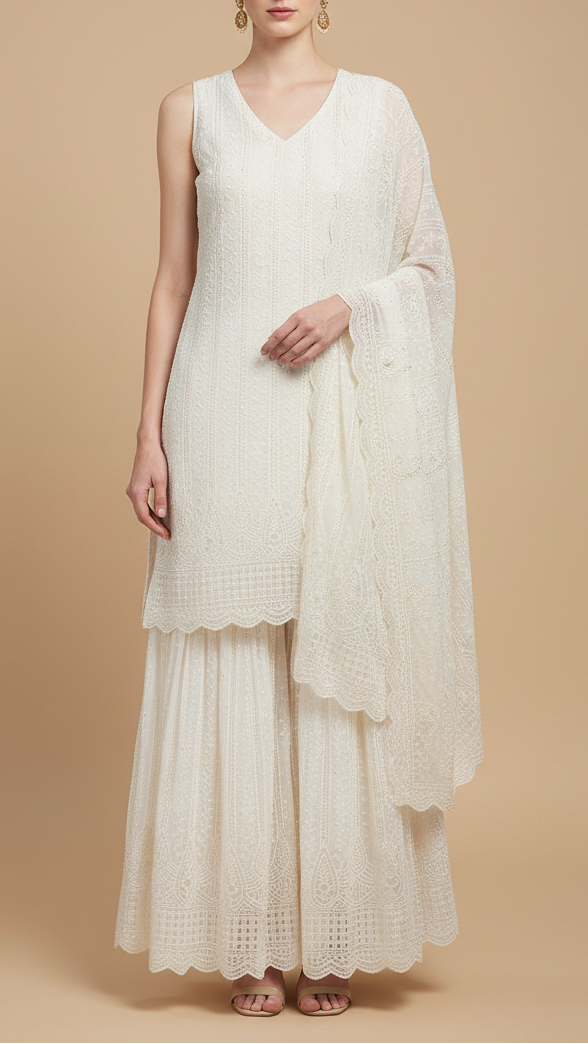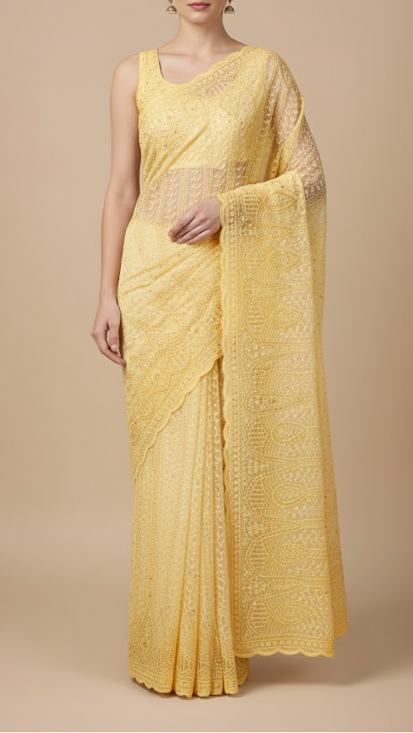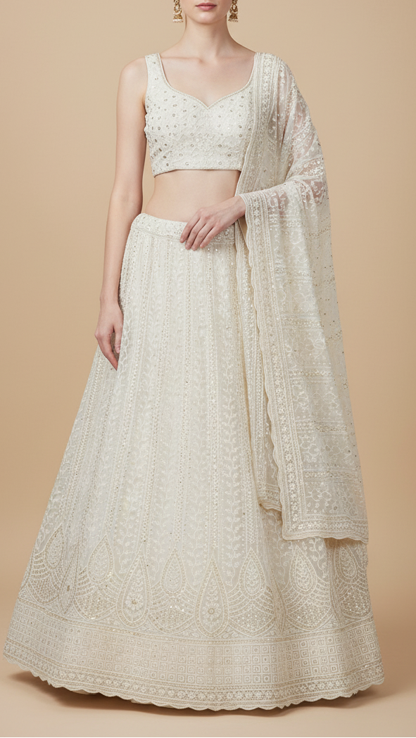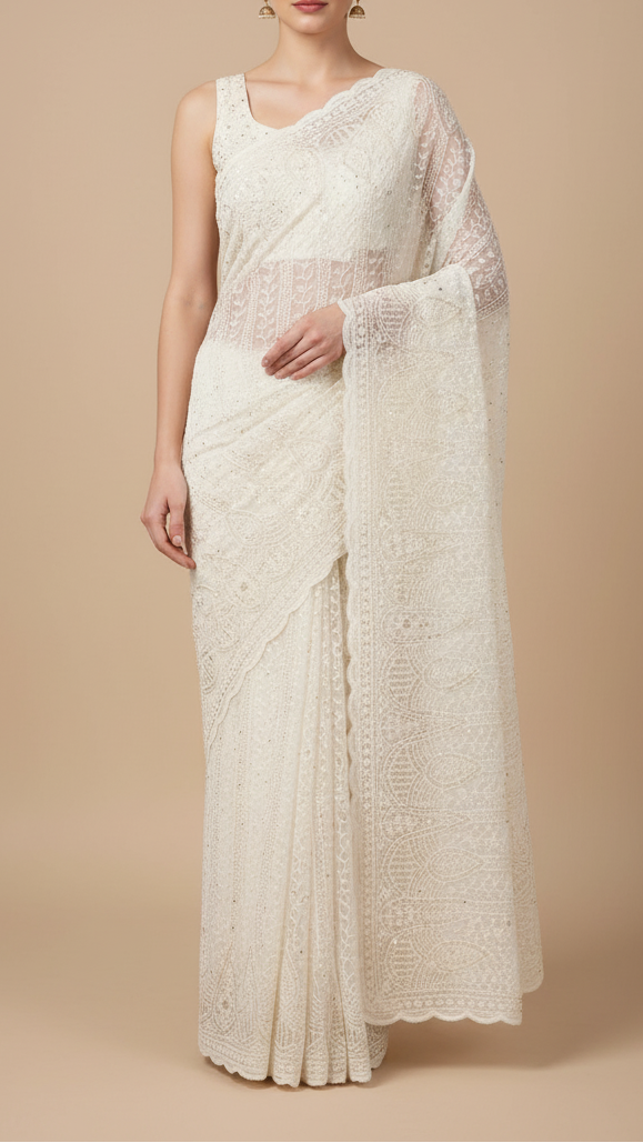 | Fabric Name | White Georgette Fabric with Allover Thread and Sequins Work with One-Side Scalloped Border |