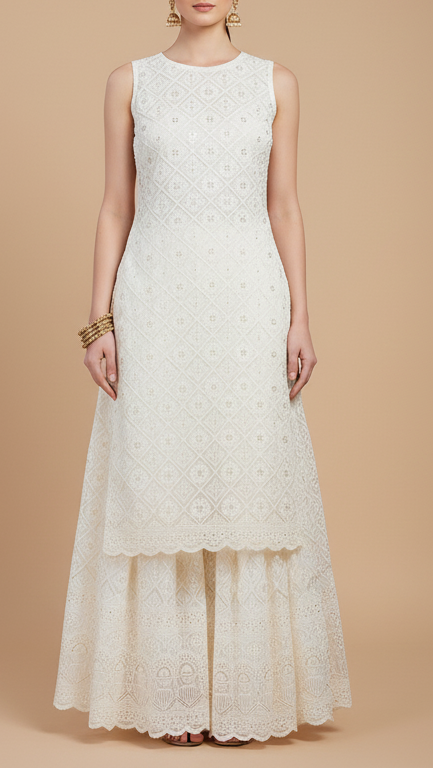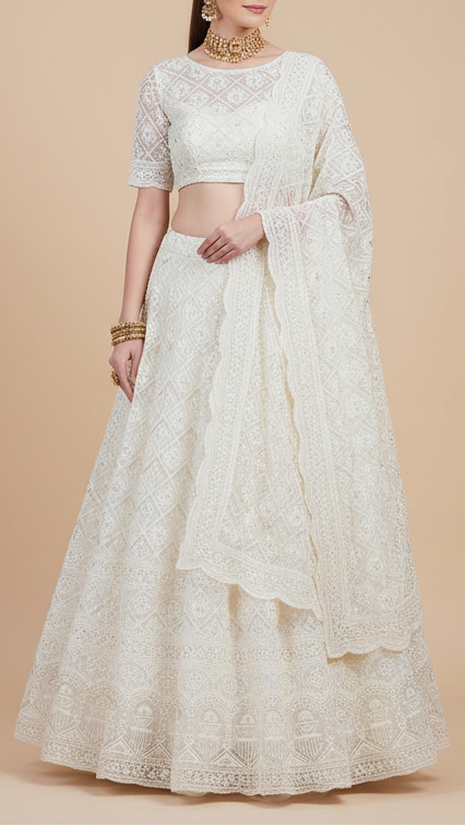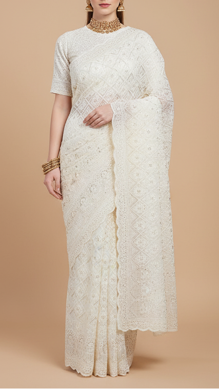 | Fabric Name | White Georgette Fabric with Allover Thread and Sequins Work with One-Side Scalloped Border |