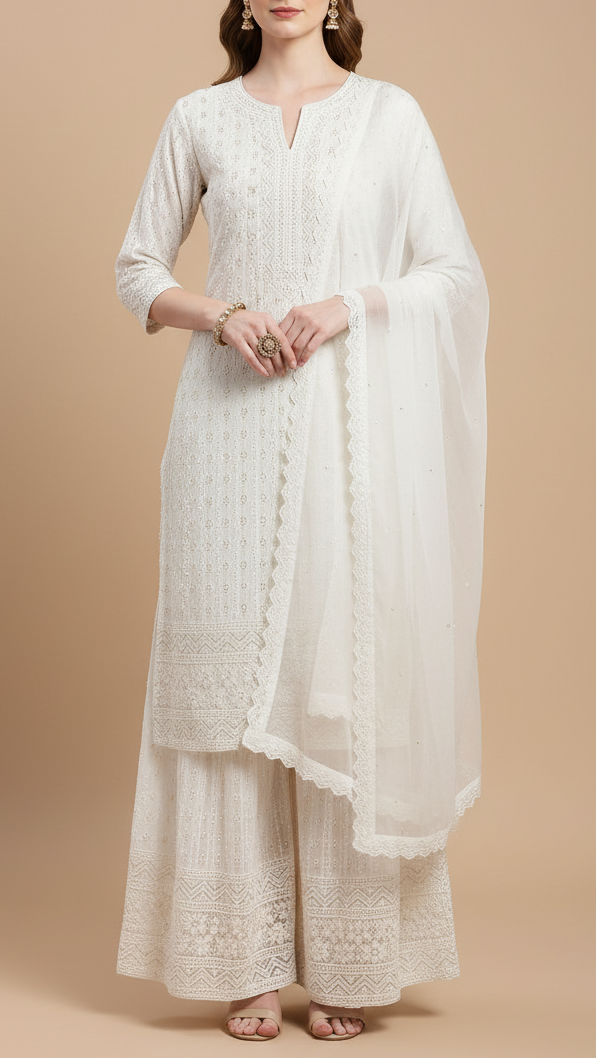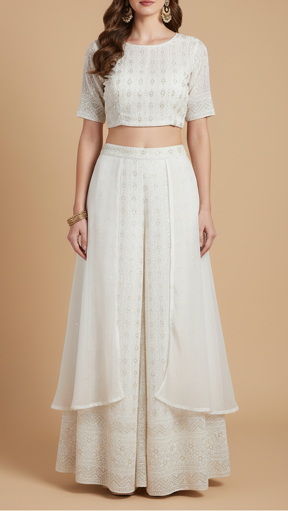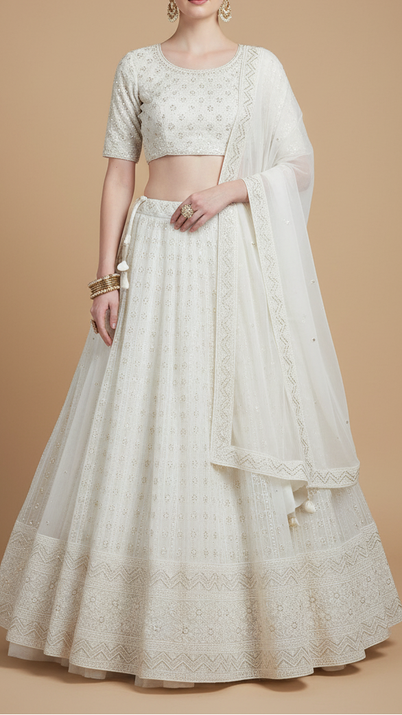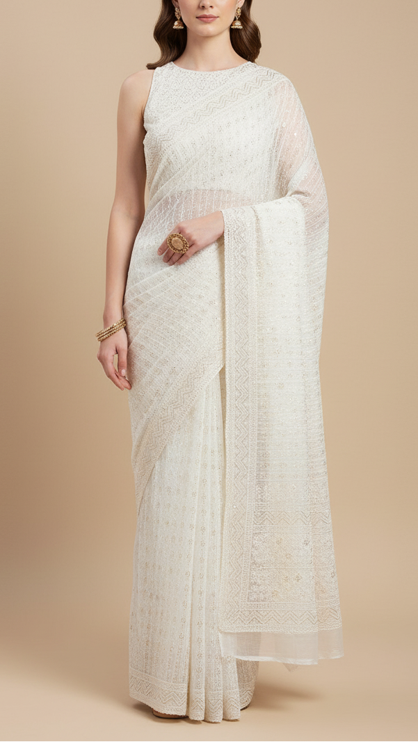 | Fabric Name | White Georgette Fabric with Allover Thread and Sequins Work with One-Side Scalloped Border |
