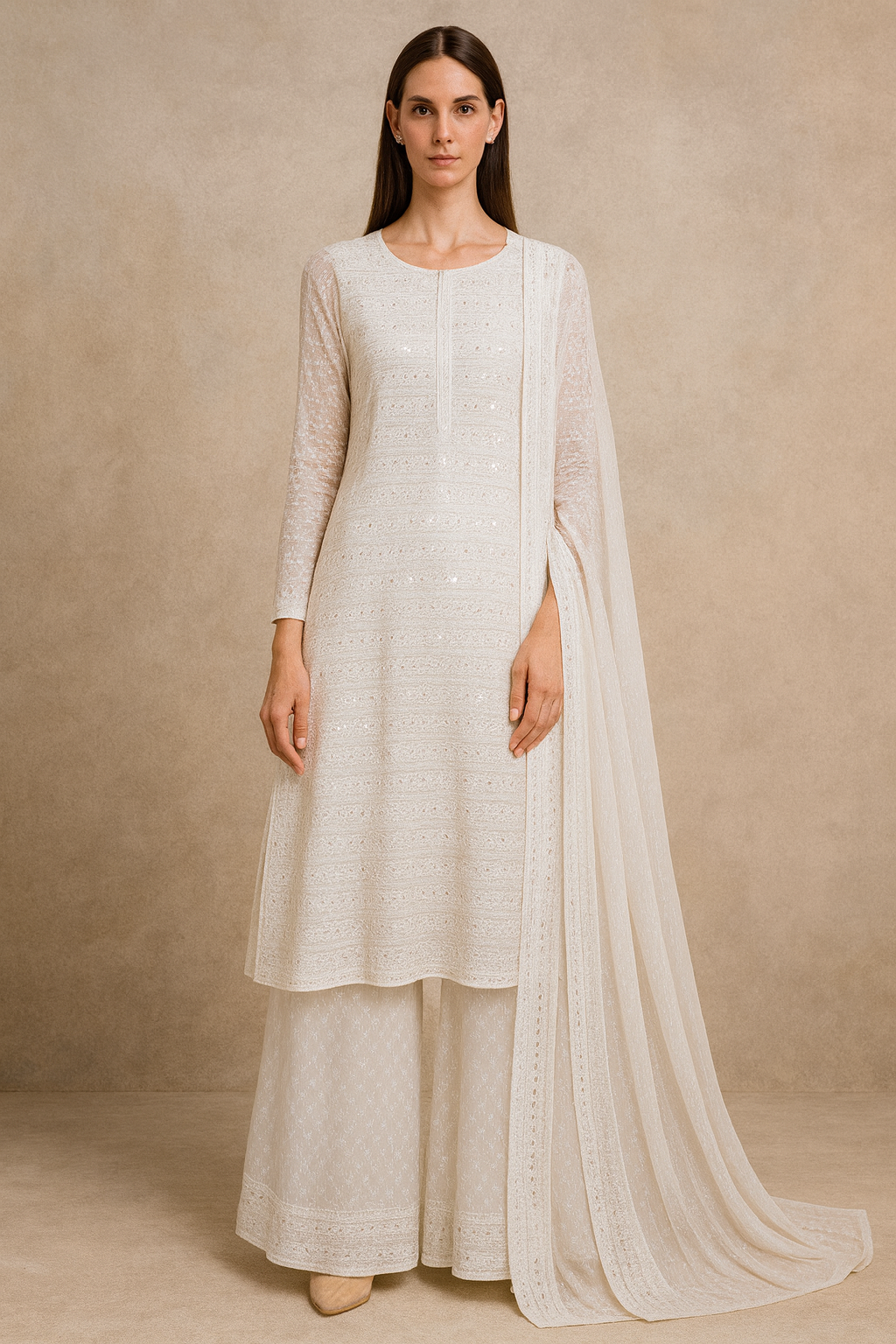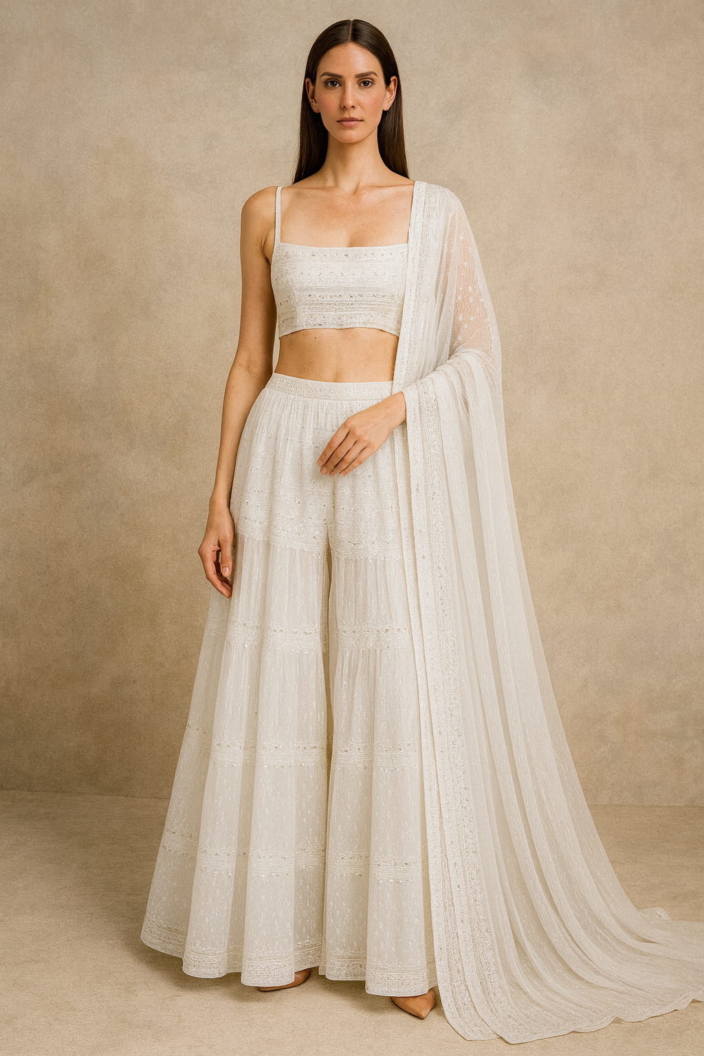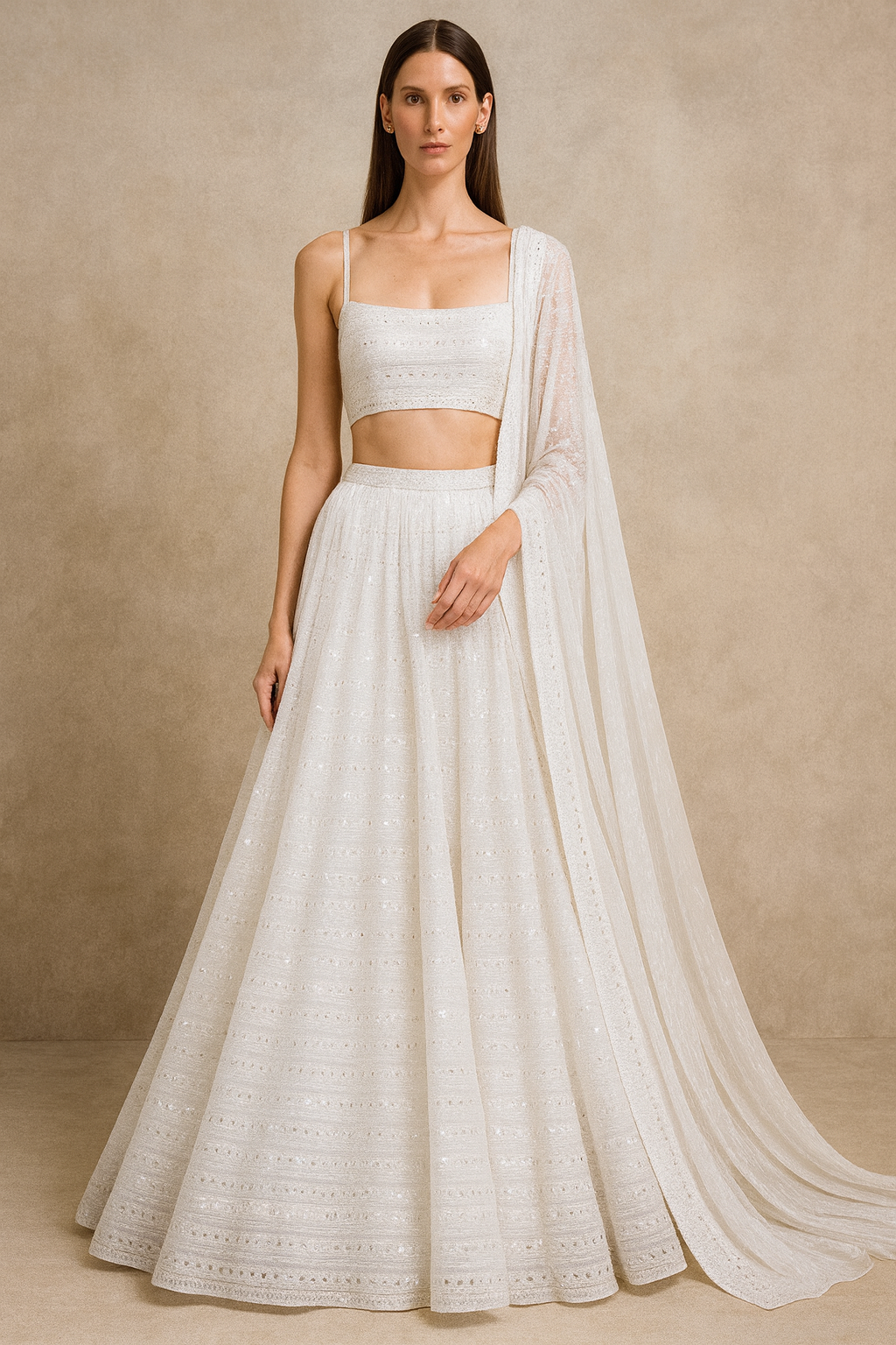 | Fabric Name | White Georgette Fabric with Allover White Thread, Sequins and Faux Mirror Work |