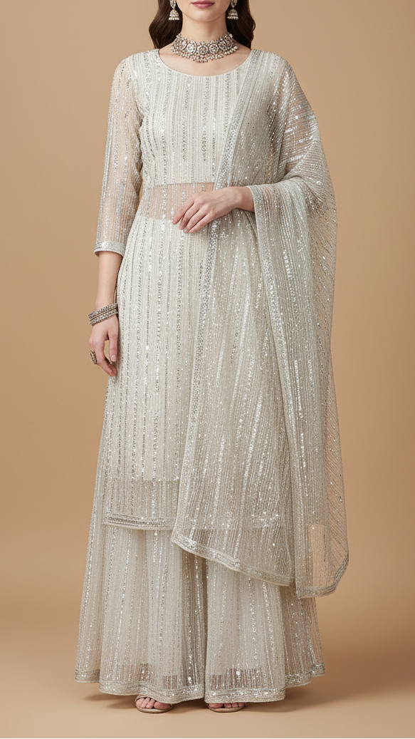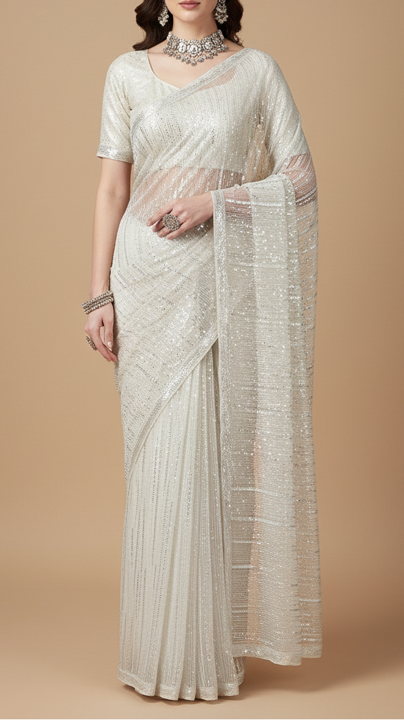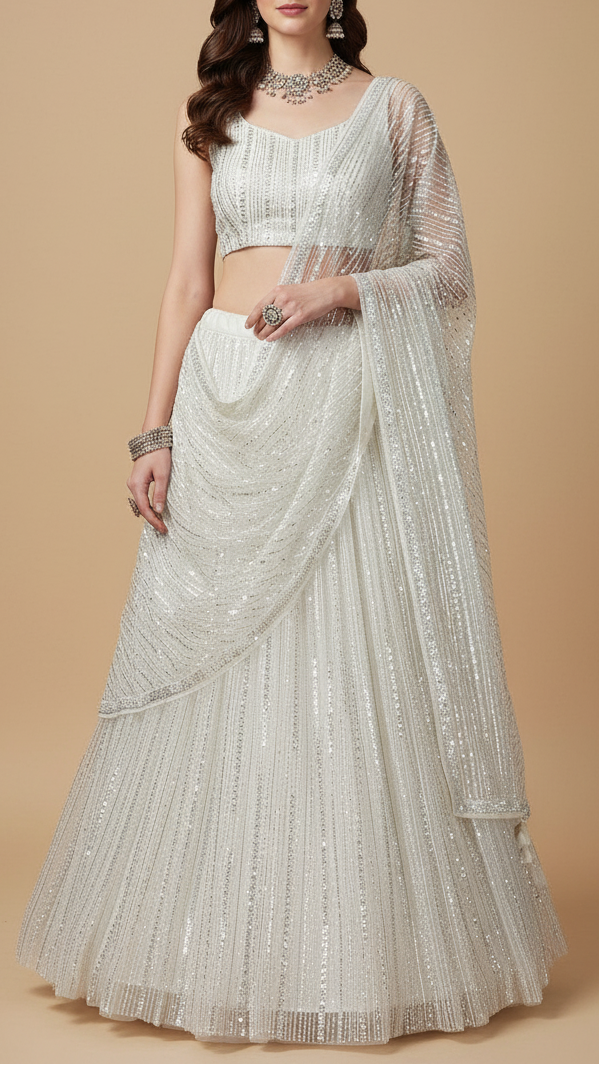 Perfect for creating sarees, lehengas, dupattas, and gowns, as well as bridal and reception ensembles. The shimmering sequins and bead detailing make it ideal for wedding functions, evening events, and festive occasions, offering a refined, glamorous, and timeless look.
