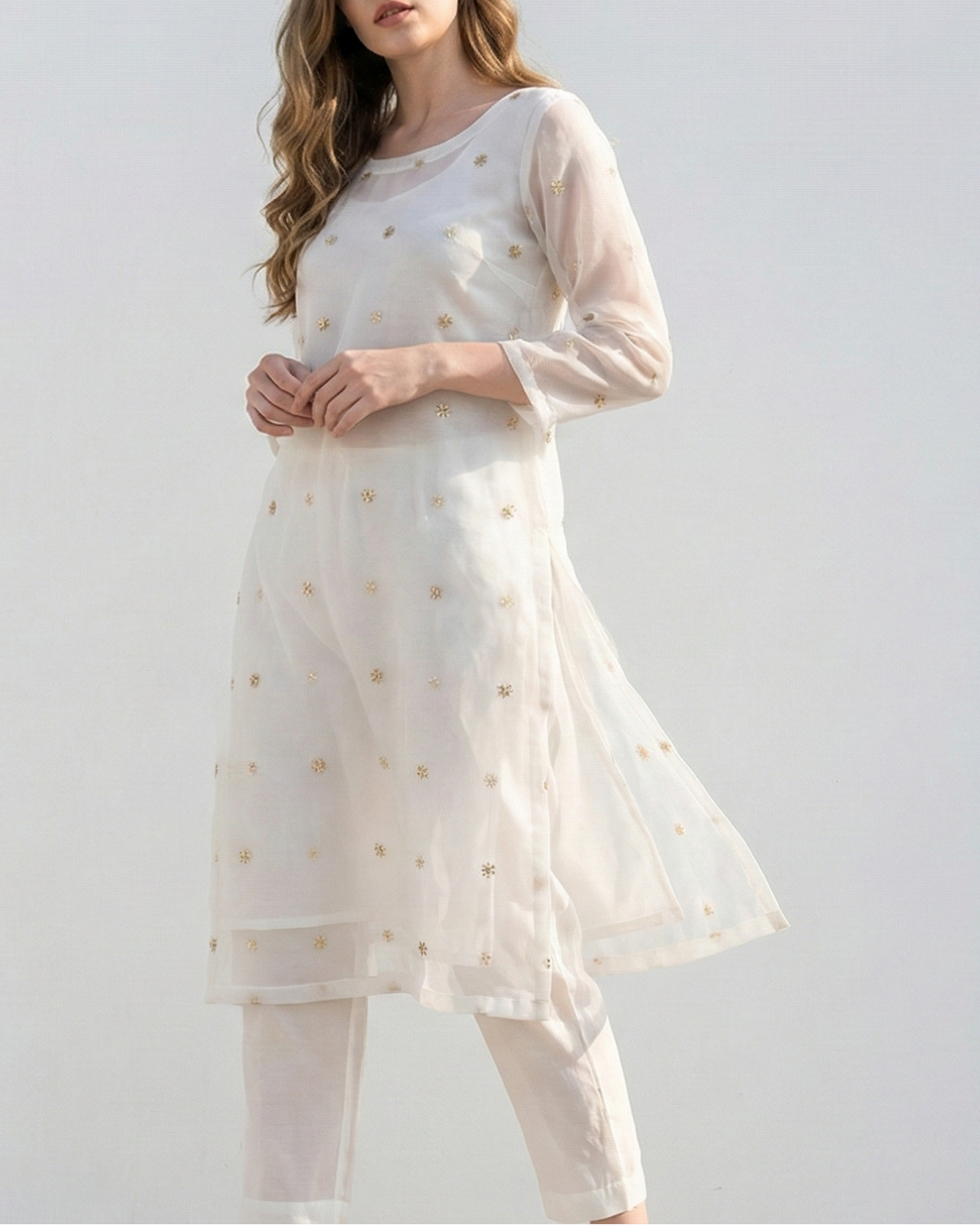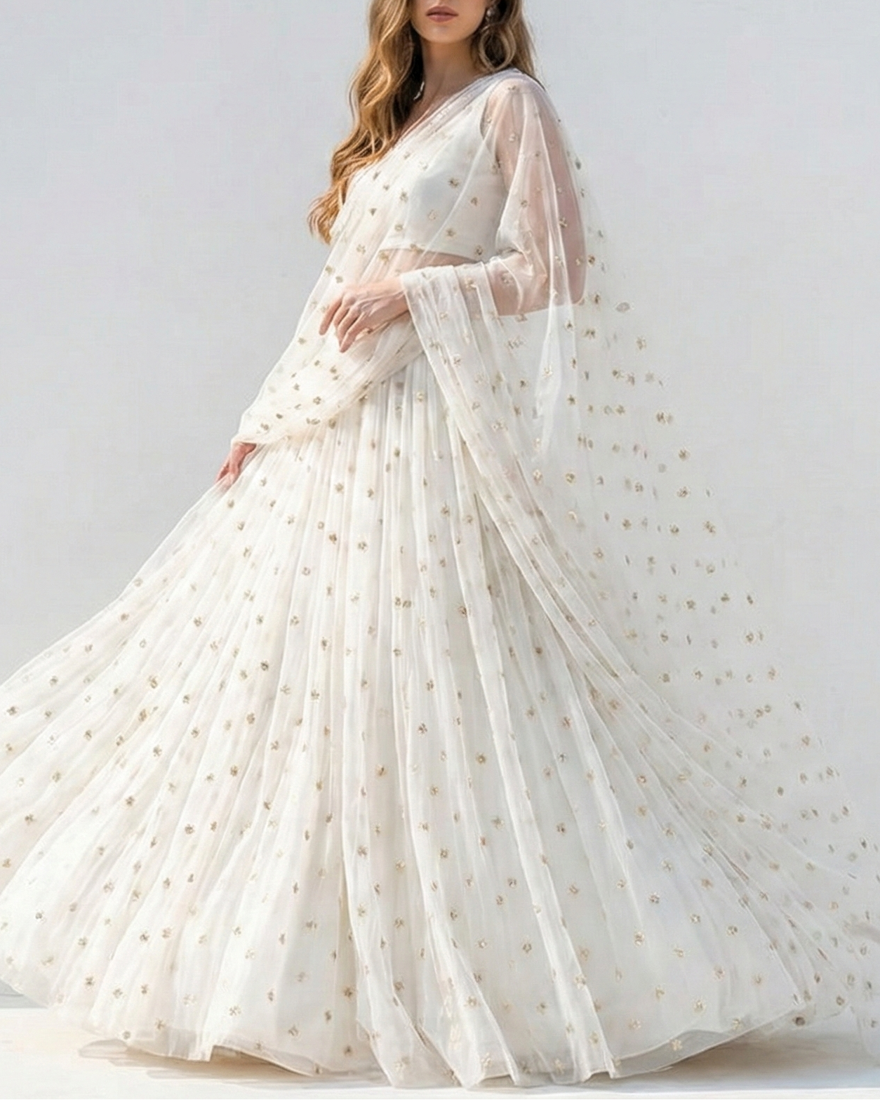 | Fabric Name | White Dyeable Organza Fabric With Allover Buti Of Golden Katdana And Sequins Work |