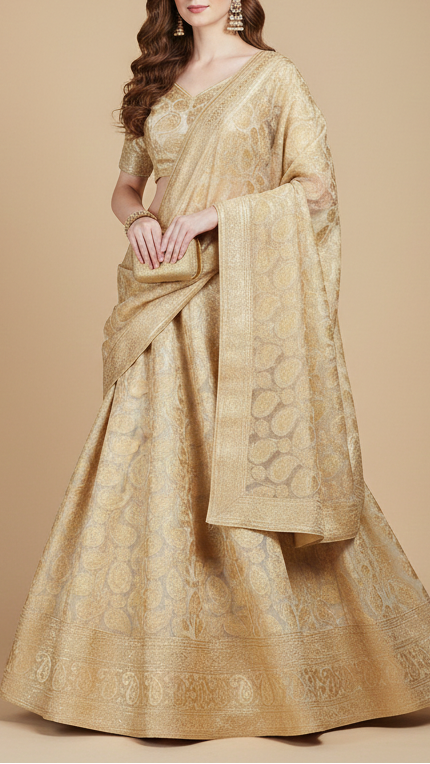 | Fabric Name | White Organza Tissue Fabric With All Over Golden Zari Handloom |