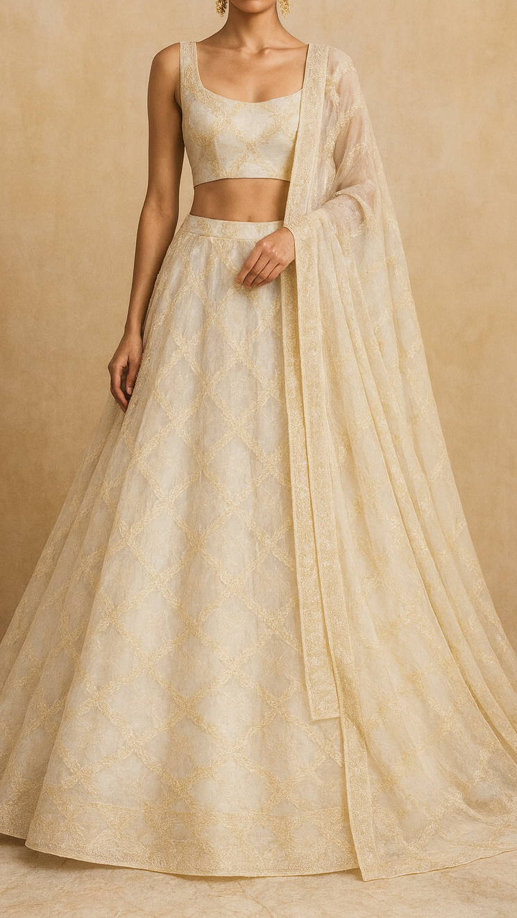 Ideal for designing sarees, lehengas, and anarkalis, as well as dupatta borders, blouses, and fusion wear. Its elegant texture and golden detailing make it perfect for wedding, festive, and evening ensembles
