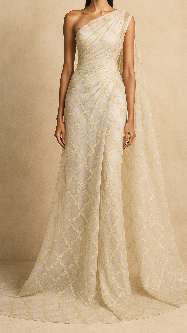 | Fabric Name | White Organza Tissue Fabric with Allover Golden Zari Jaal Pattern Handloom |