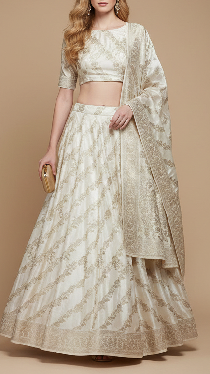 | Fabric Name | White Satin Fabric With Allover Zari And Thread Handloom Diagonal Stripes |