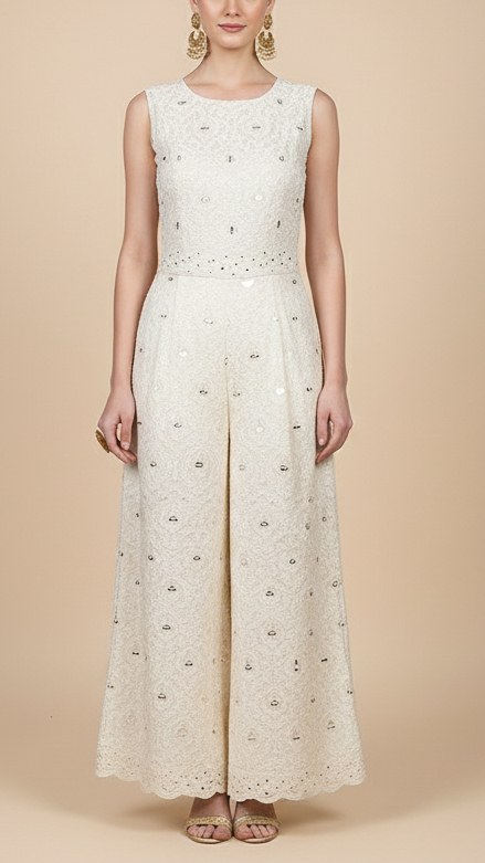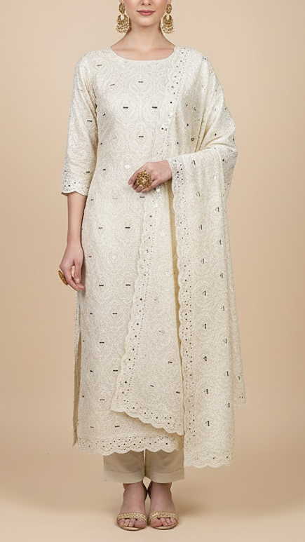 | Fabric Name | White Silk Dupion Fabric With All Over Thread And Faux Mirror Work |