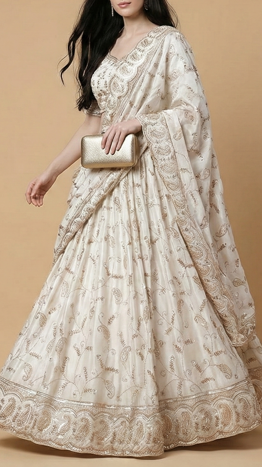 | Fabric Name | White Dyeable Silk Fabric With All Over Katdana, Sequins And Bead Work With One Side Heavy Border |
