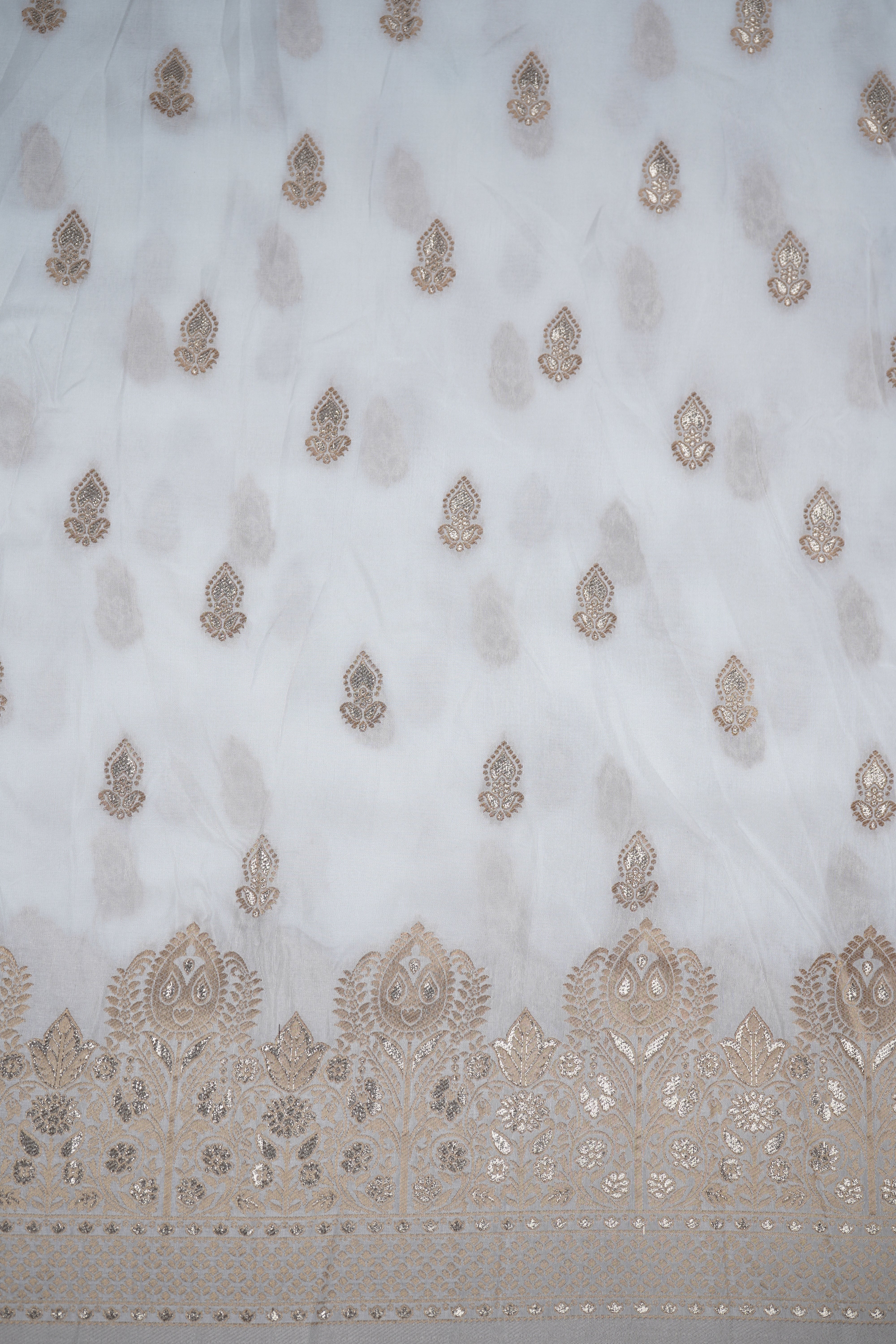 | Fabric Name | White Upada Silk Fabric with Allover Zari Handloom and One-Side Border |