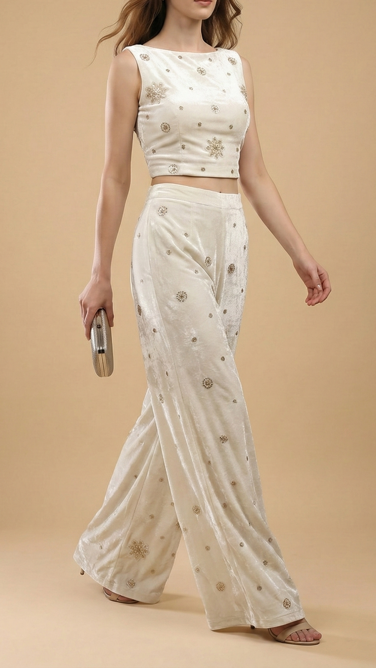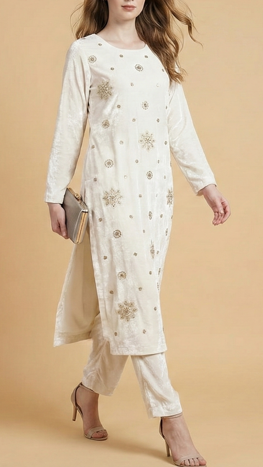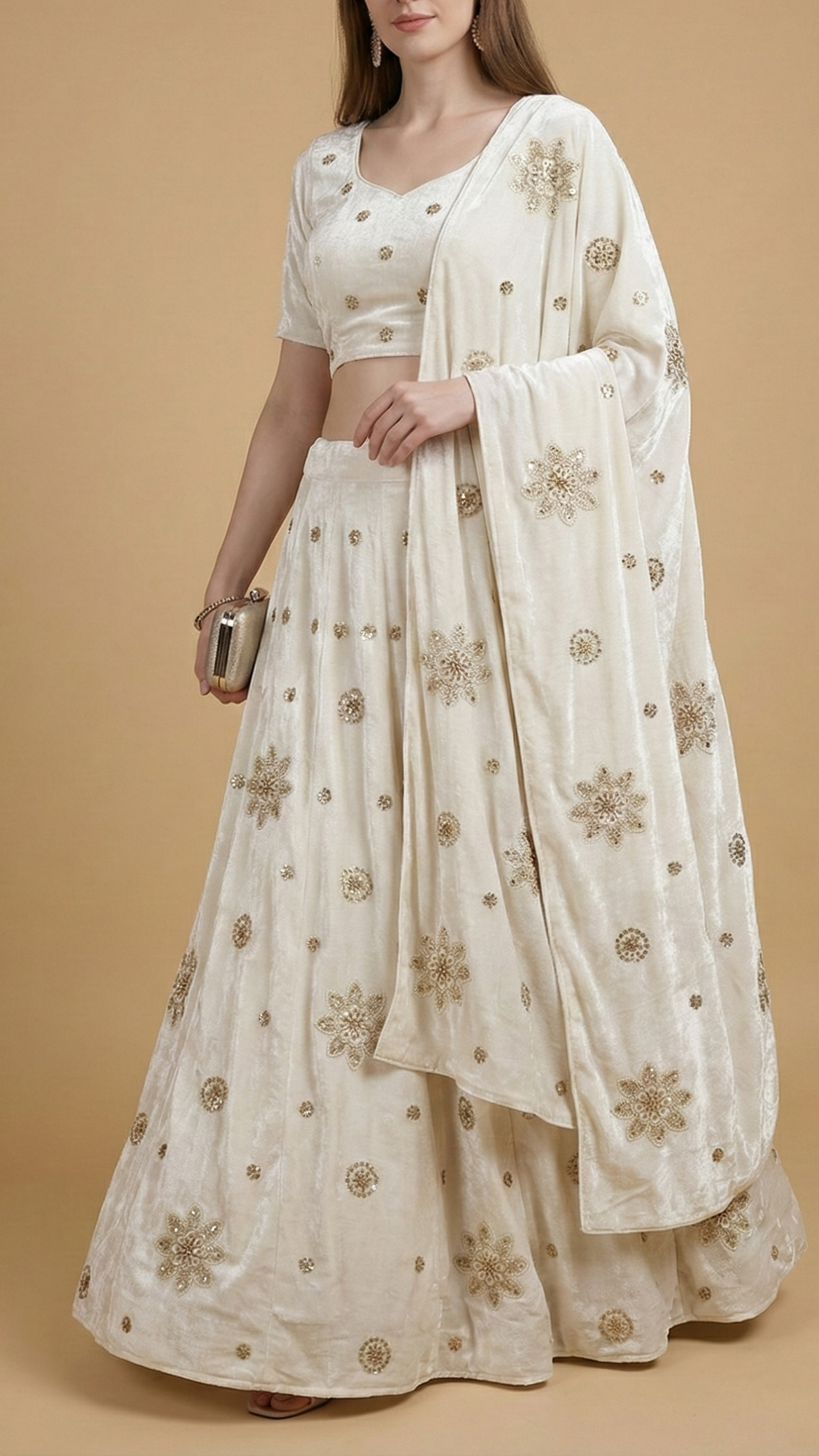 | Fabric Name | White Velvet Fabric With All Over Buti Of Katdana, Sequins And Bead |