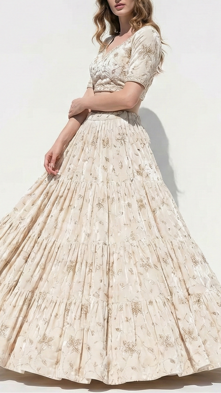 Perfect for lehenga, sarees, anarkalis, jackets, ethinic jumpsuits, sherwani, etc. The rich look of this fabric is ideal for festive outfits, wedding attire & traditional wear.