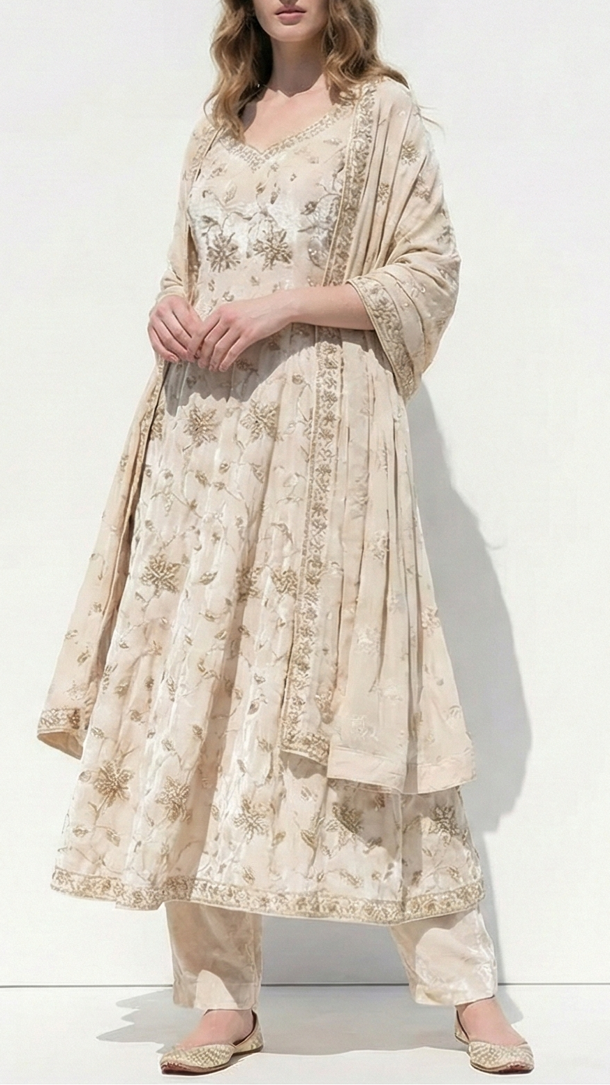 | Fabric Name | White Velvet Fabric With All Over Sequins, Zari, Katdana Work |