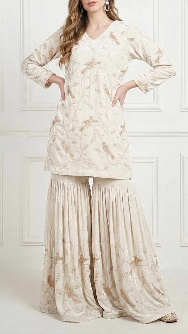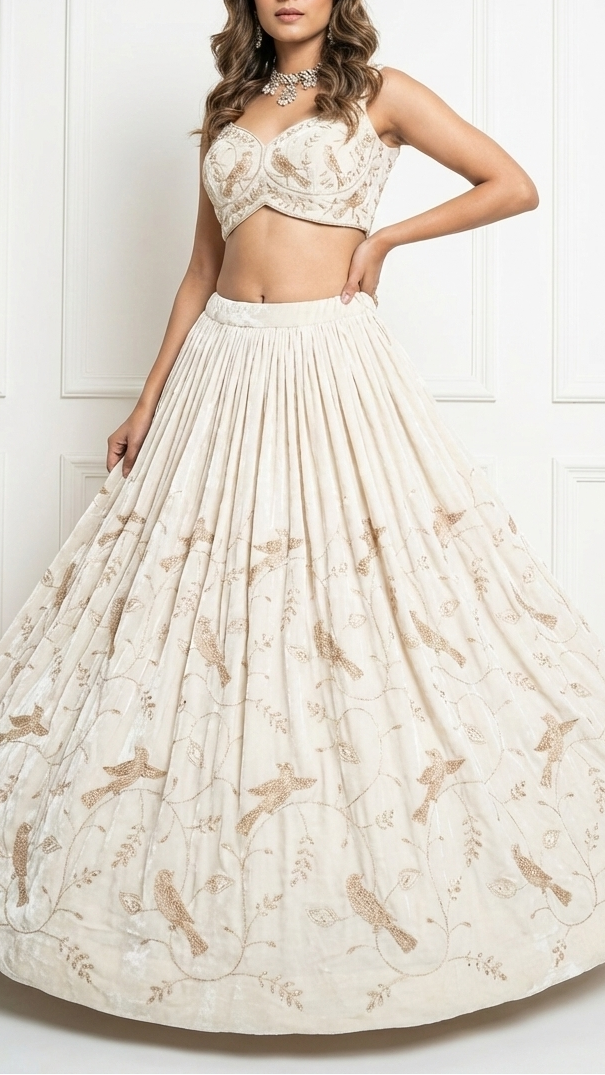 | Fabric Name | White Velvet Fabric With All Over Sequins, Zari, Katdana Work |