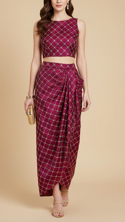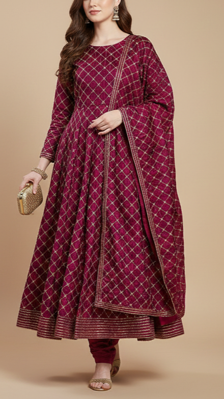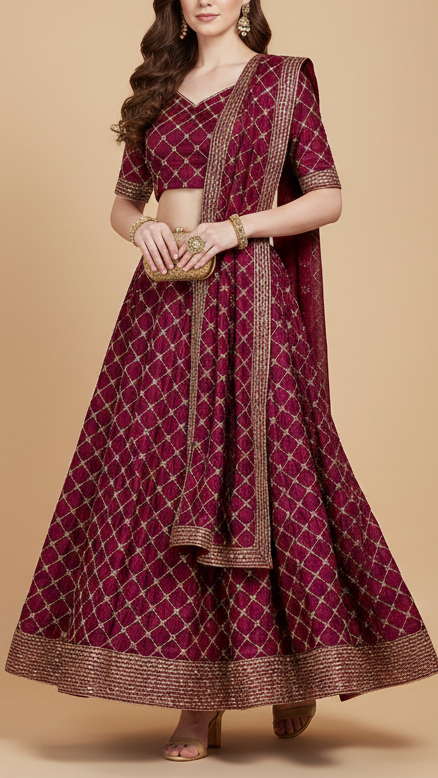 | Fabric Name | Wine Diamond Silk Fabric With All Over Zari And Katdana Work |