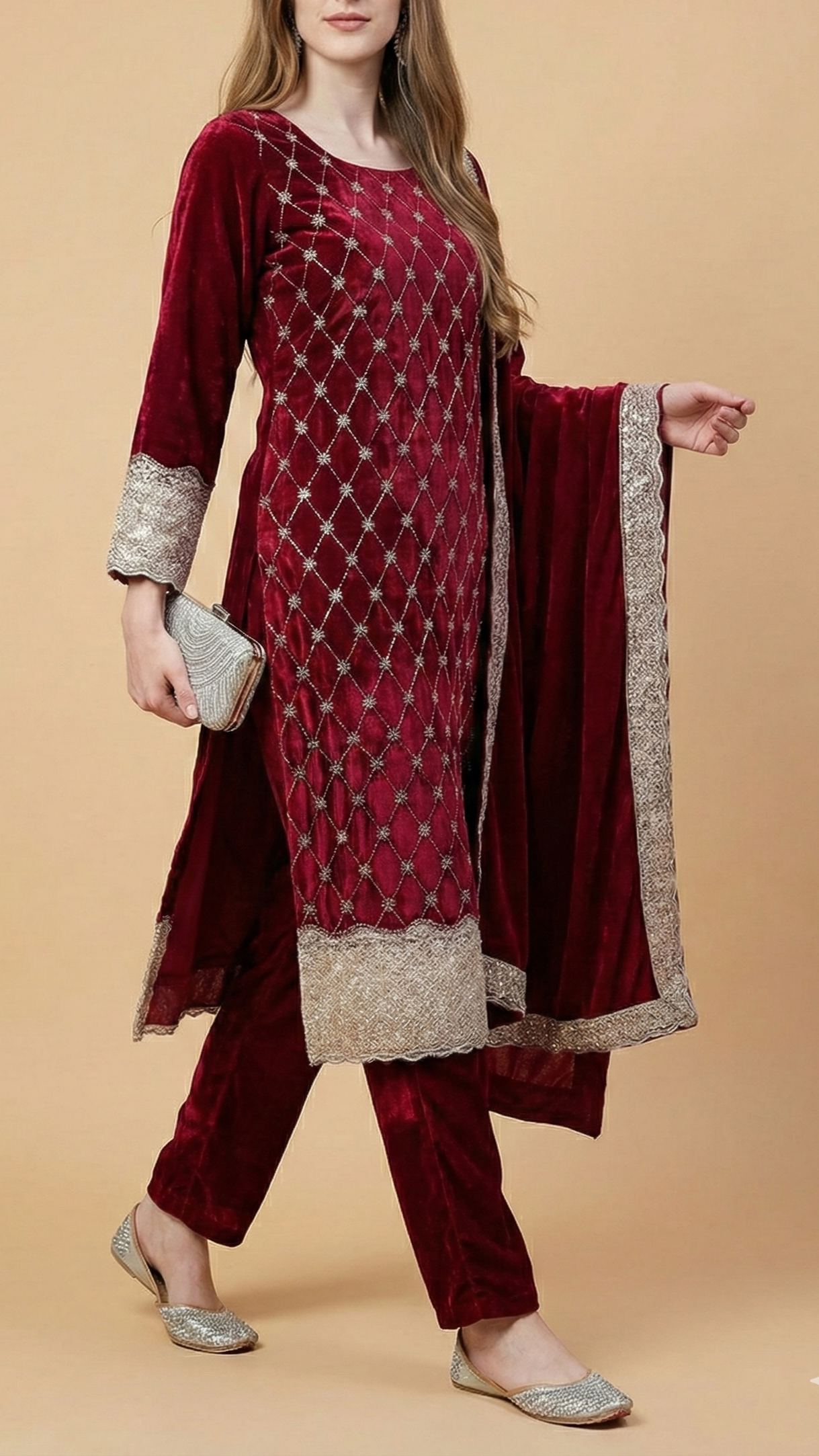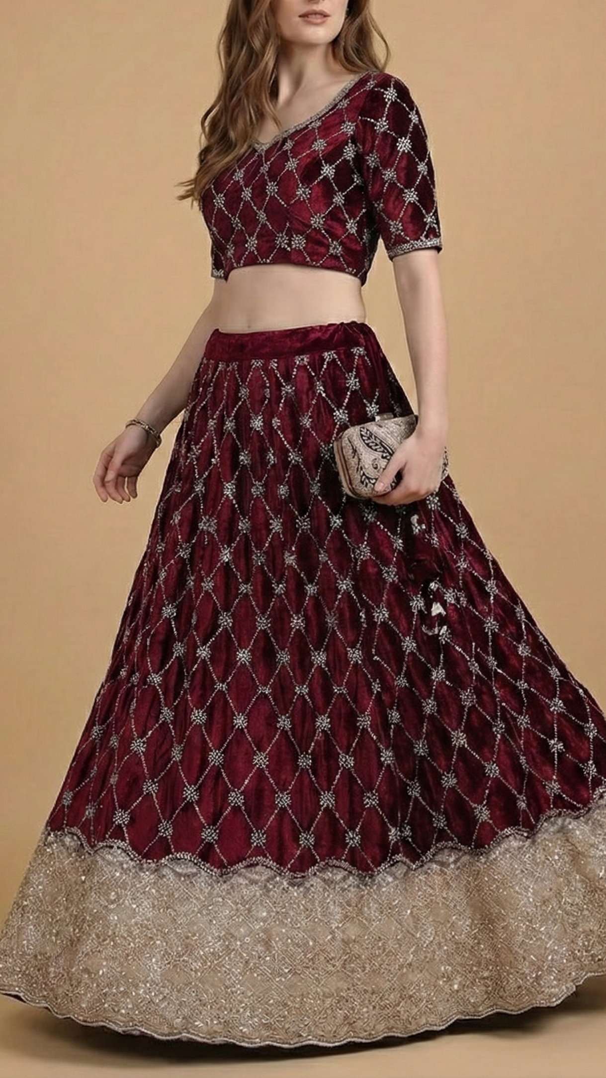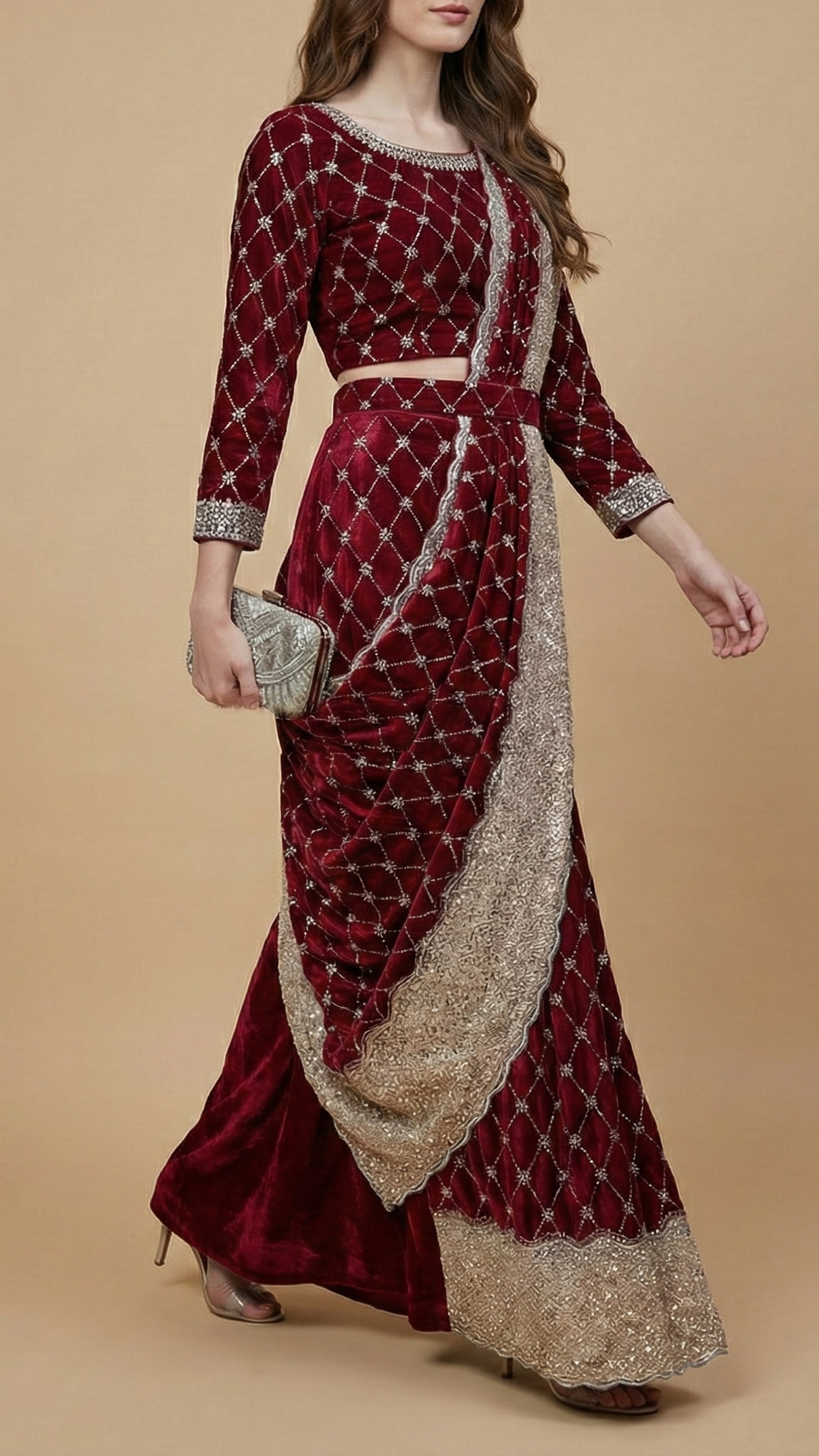 | Fabric Name | Wine Velvet Fabric With All Over Buti Of Katdana, Pearl And Bead With One Side Border |