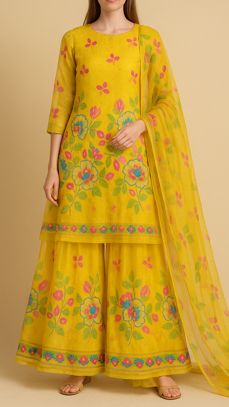 | Fabric Name | Yellow Georgette Printed Fabric Embellished with Pearl, Sequins and Katdana Work With One-Side Border |
