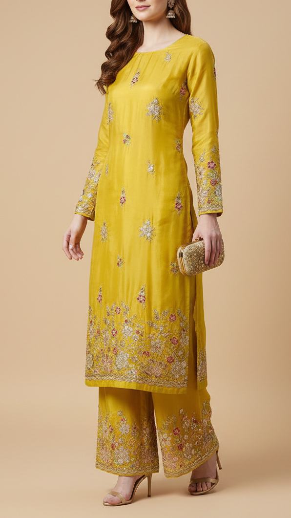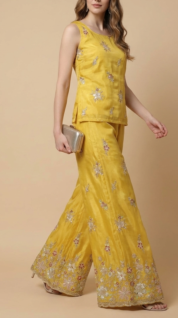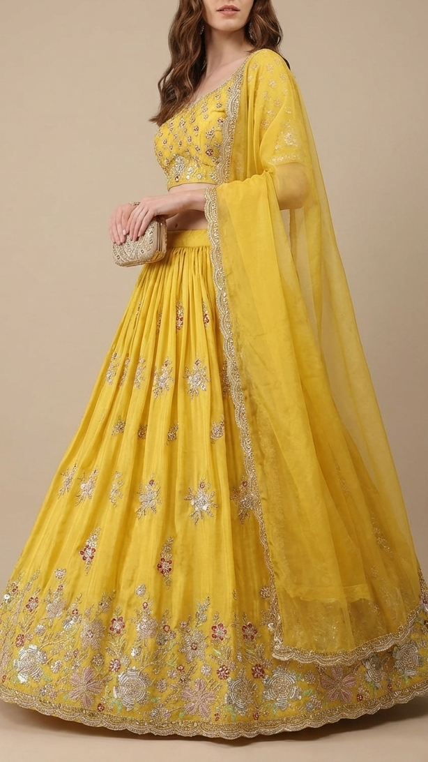 | Fabric Name | Yellow Tissue Fabric With All Over Buti Of Bead, Sequins And Thread With One Side Heavy Border |